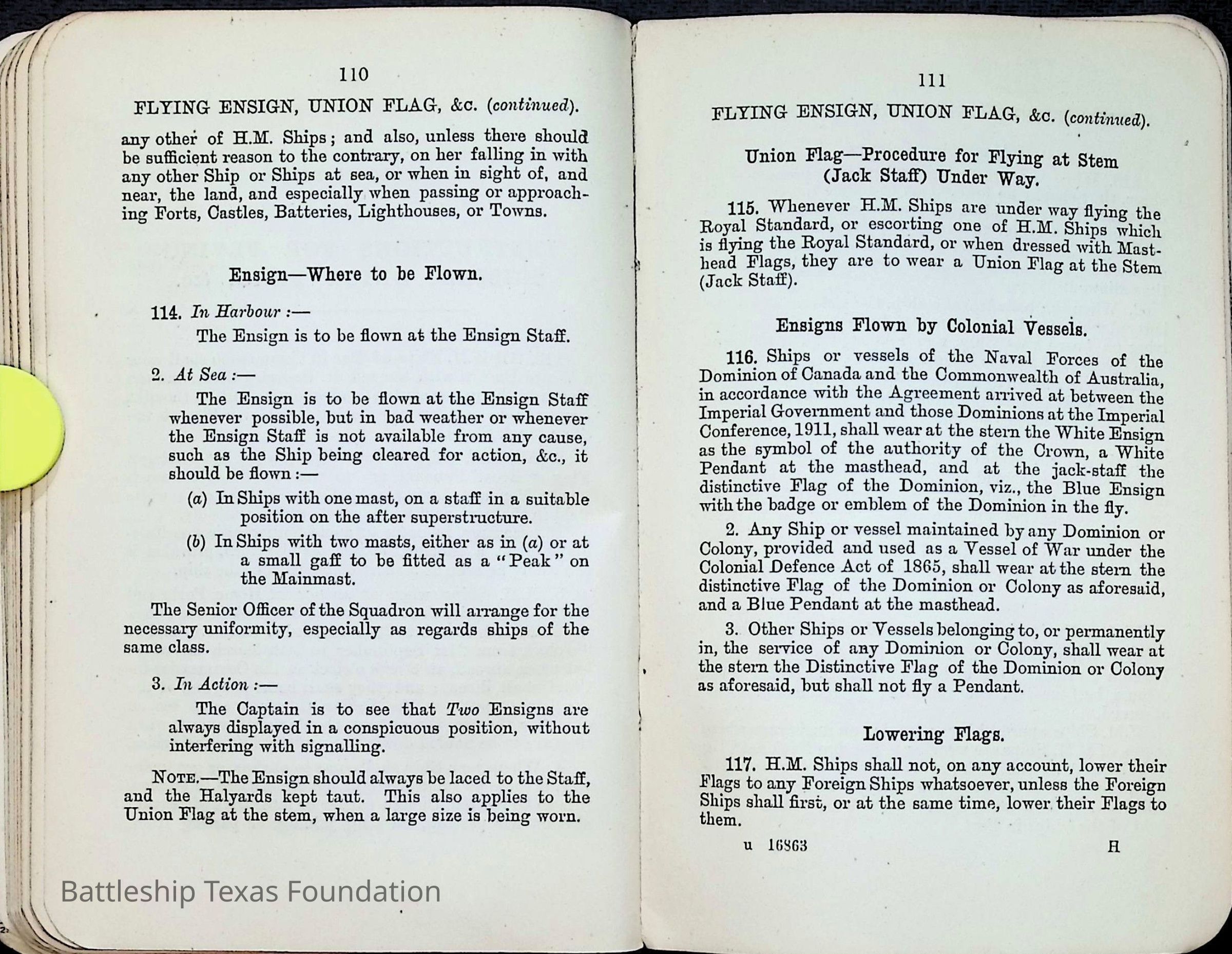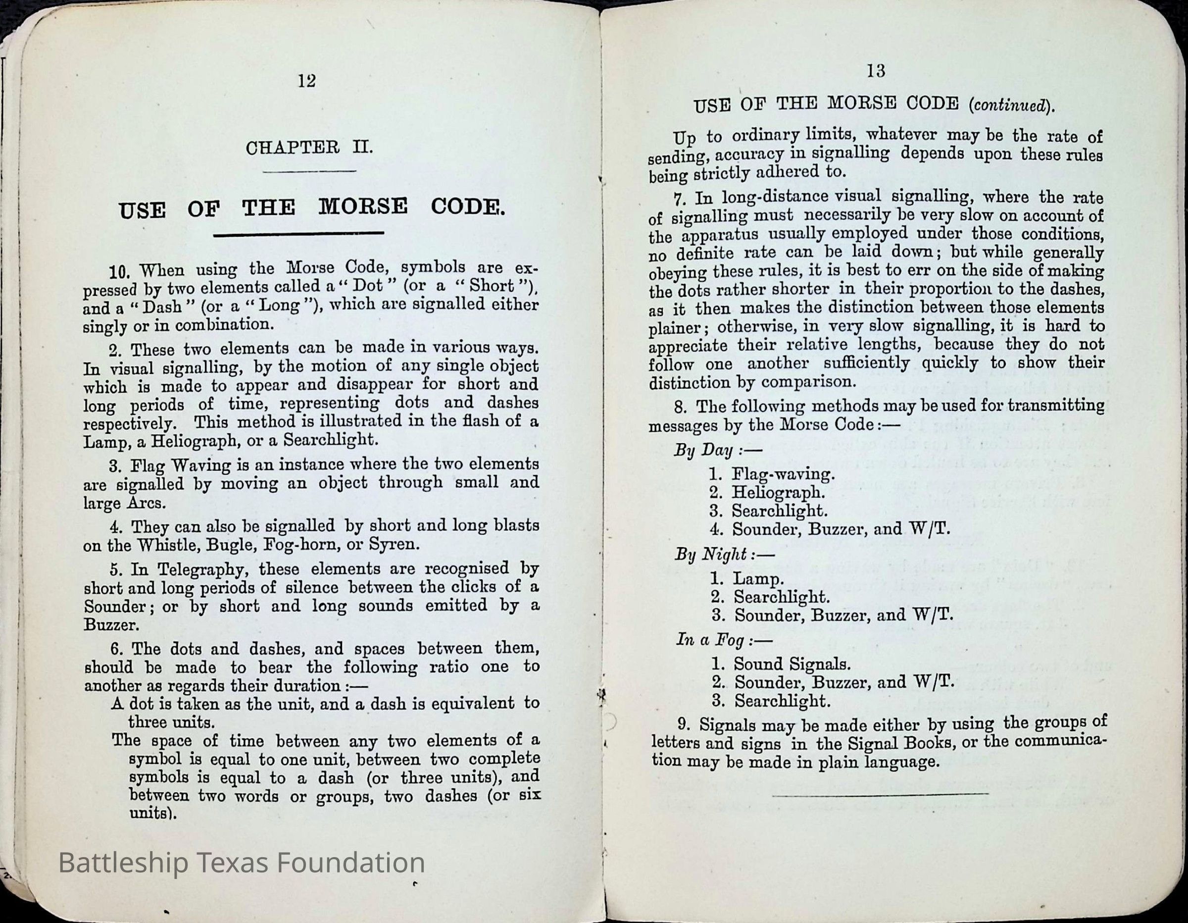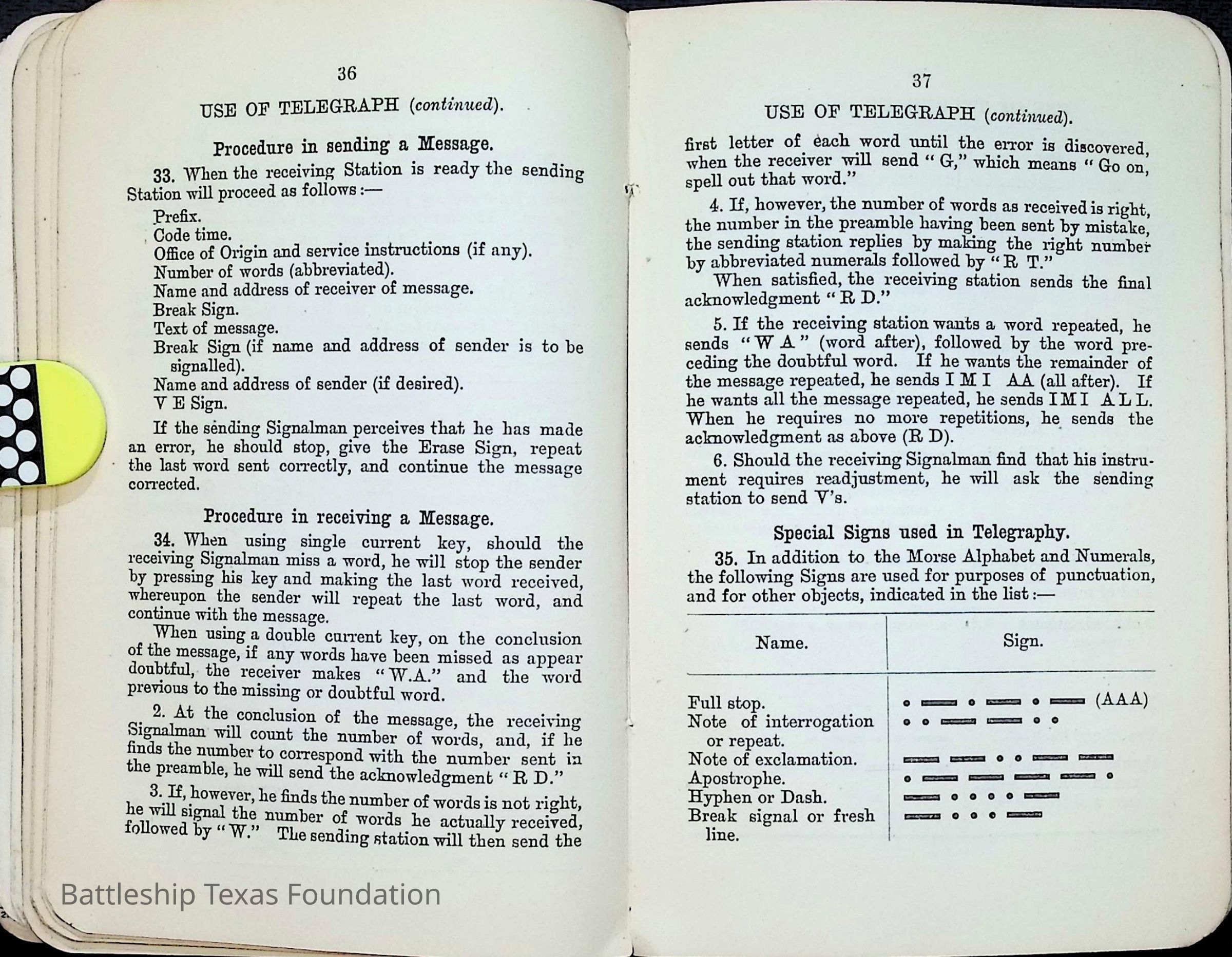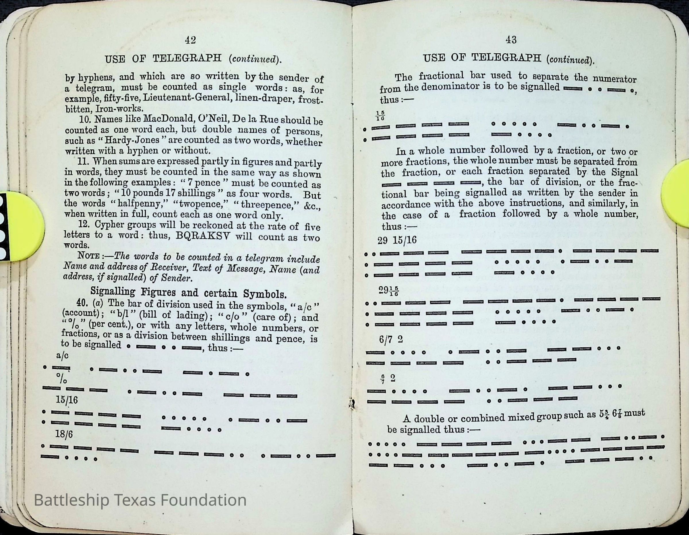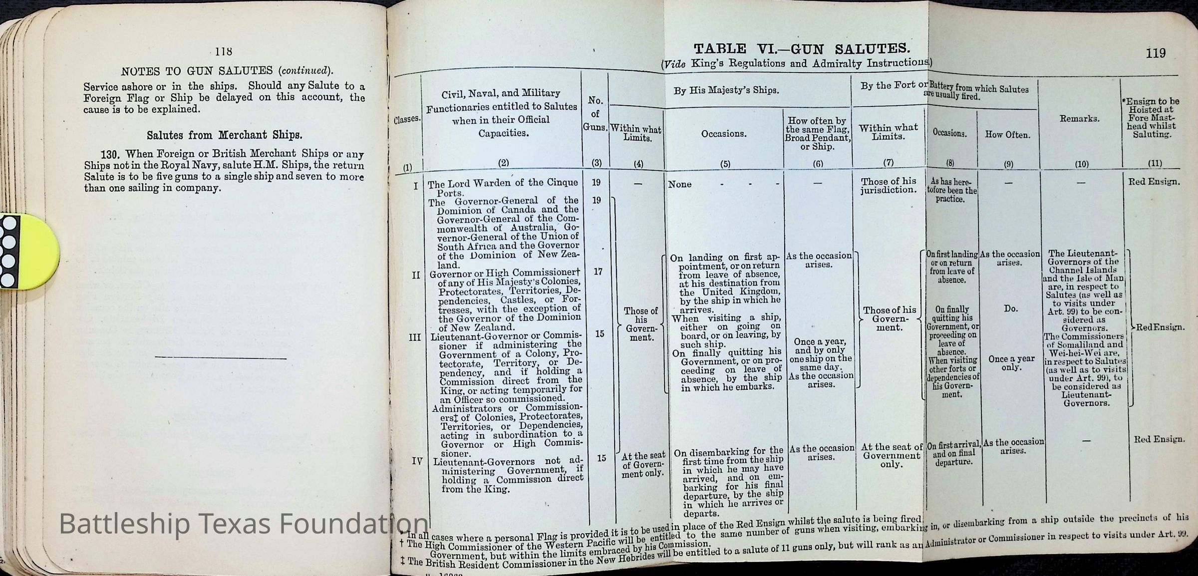 British Navy Handbook of Signalling 1913 owned by two Yeomen on USS Texas, humorously referred to as "HMS Texas" in the inside cover. Handbook was used during action with British Grand Fleet during World War One. Handbook received by crew members shortly after arriving in European waters in February 11. Dated February 24, 1918.Context