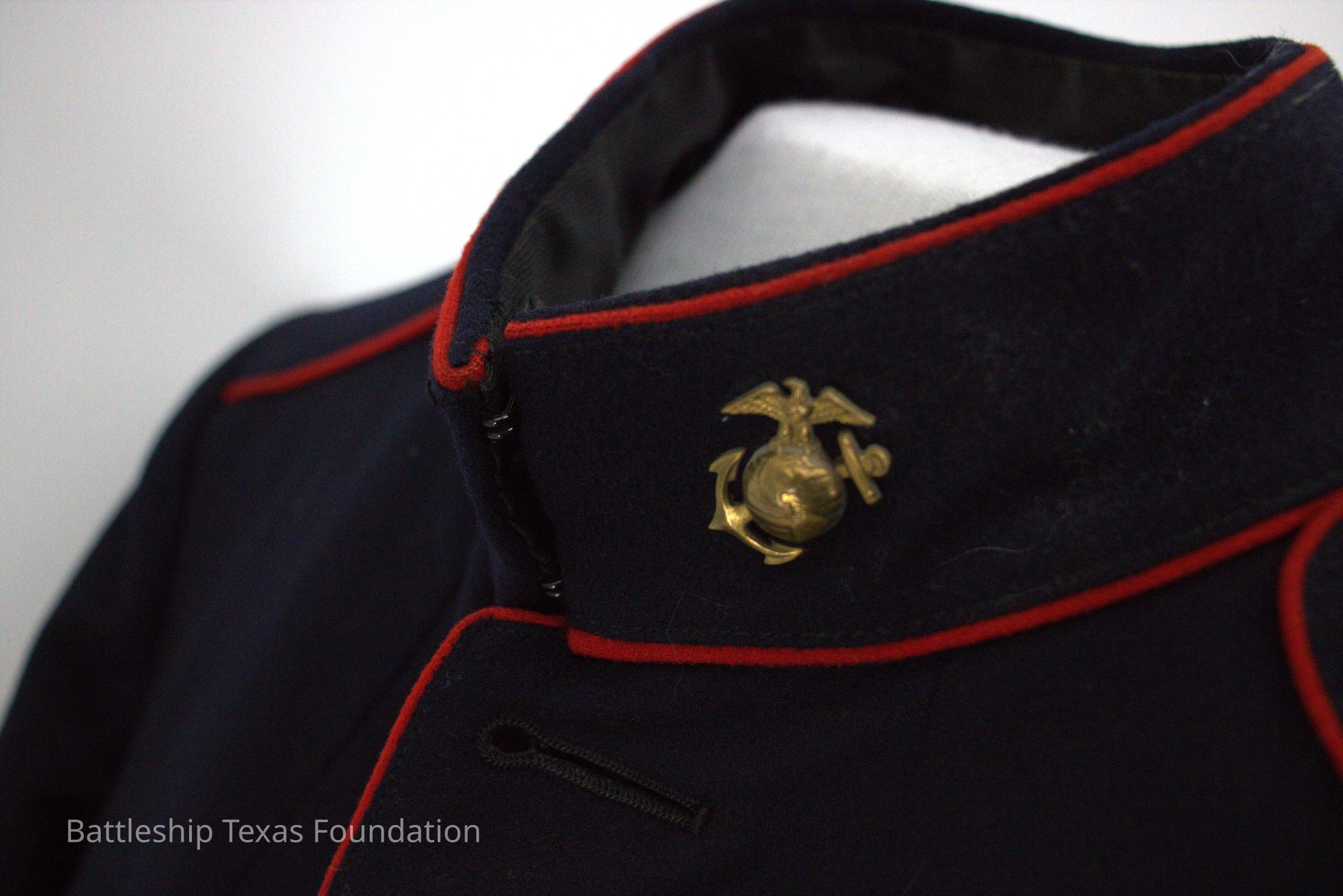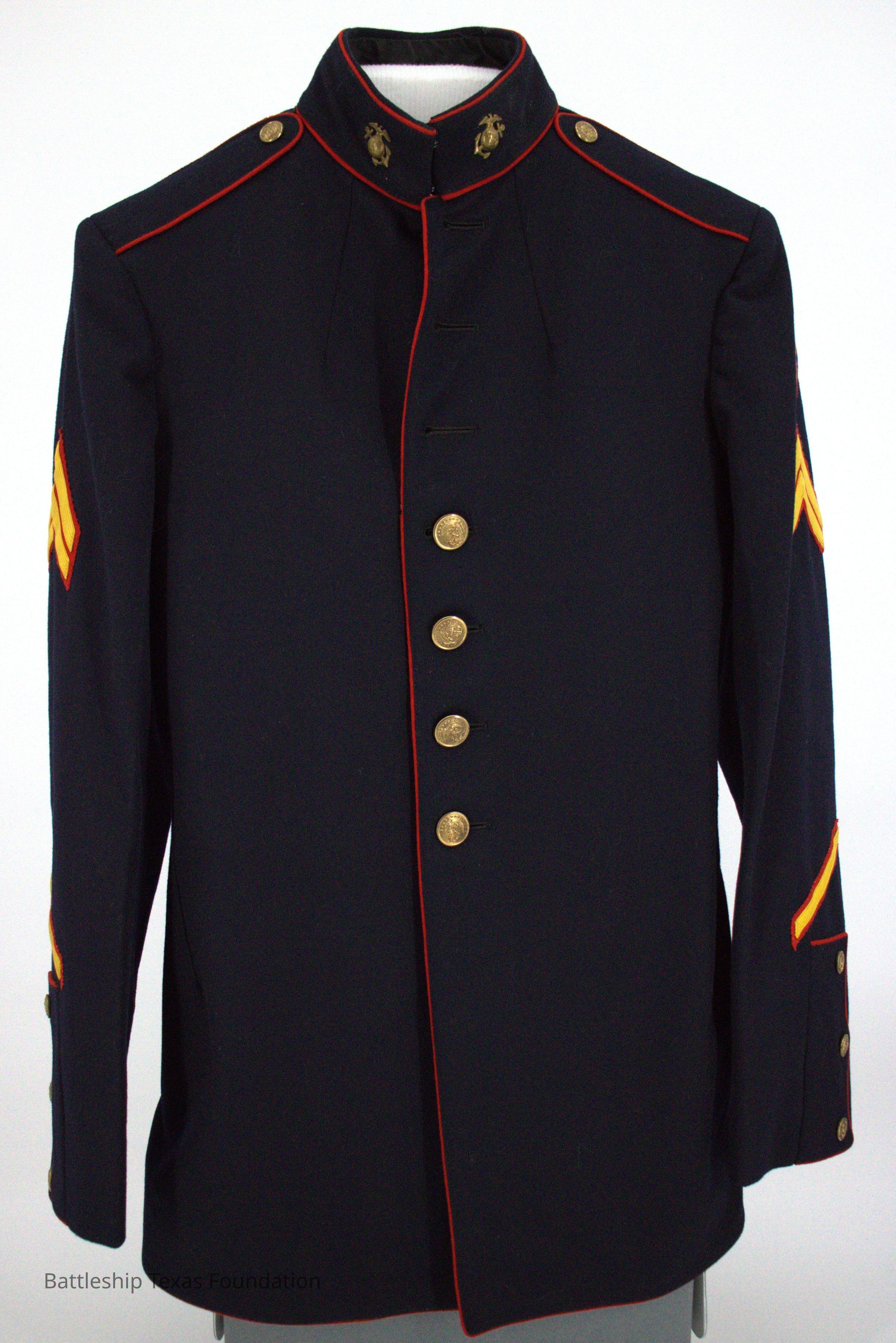 Marine Corps Dress Blues were the standard formal attire, and included a blue jumper that featured gilt buttons and red trim, blue slacks, white gloves, and a white peaked cap. Ribbons and marksmen medals could be worn on the left breast.Collection