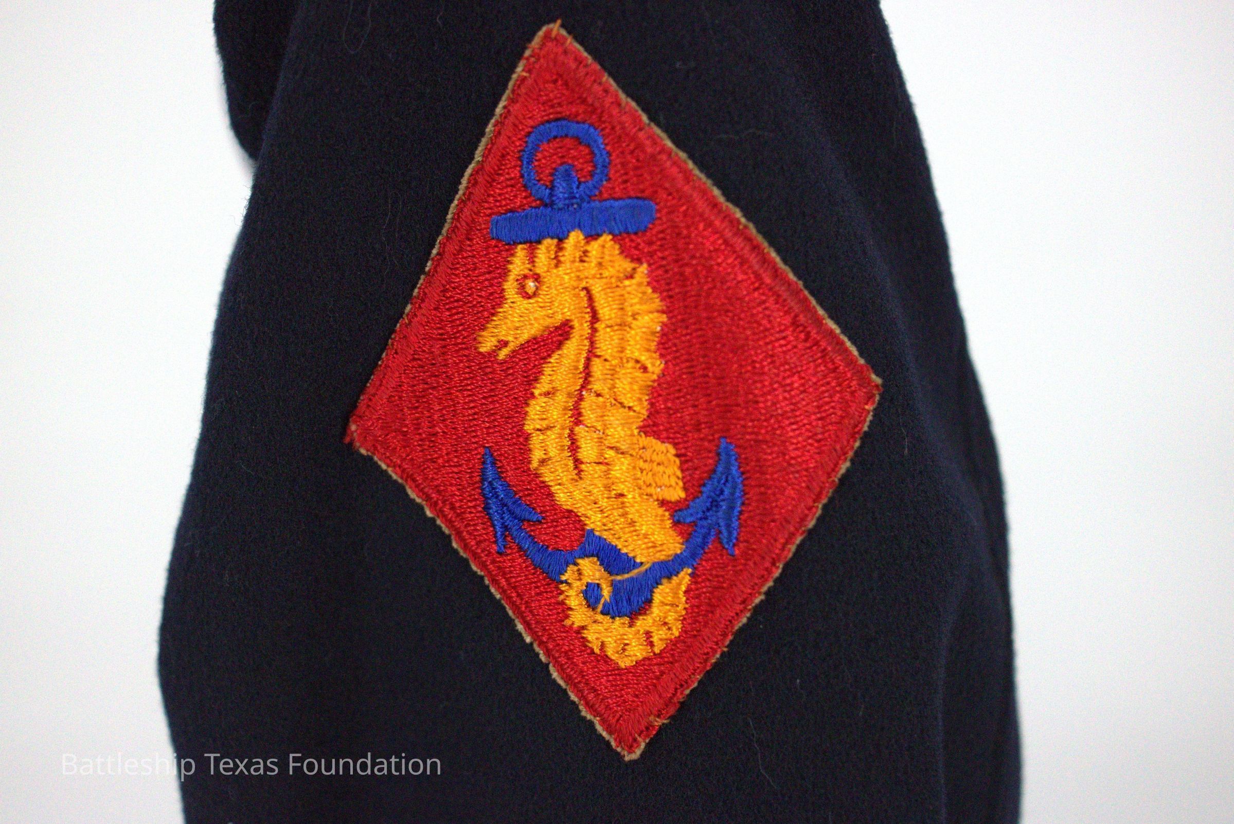 Marine Corps uniform owned by Harold E. Nichols Jr. Both EGAs are present with the top three buttons missing. Both arms have Marine Ship Detachment patch.Context