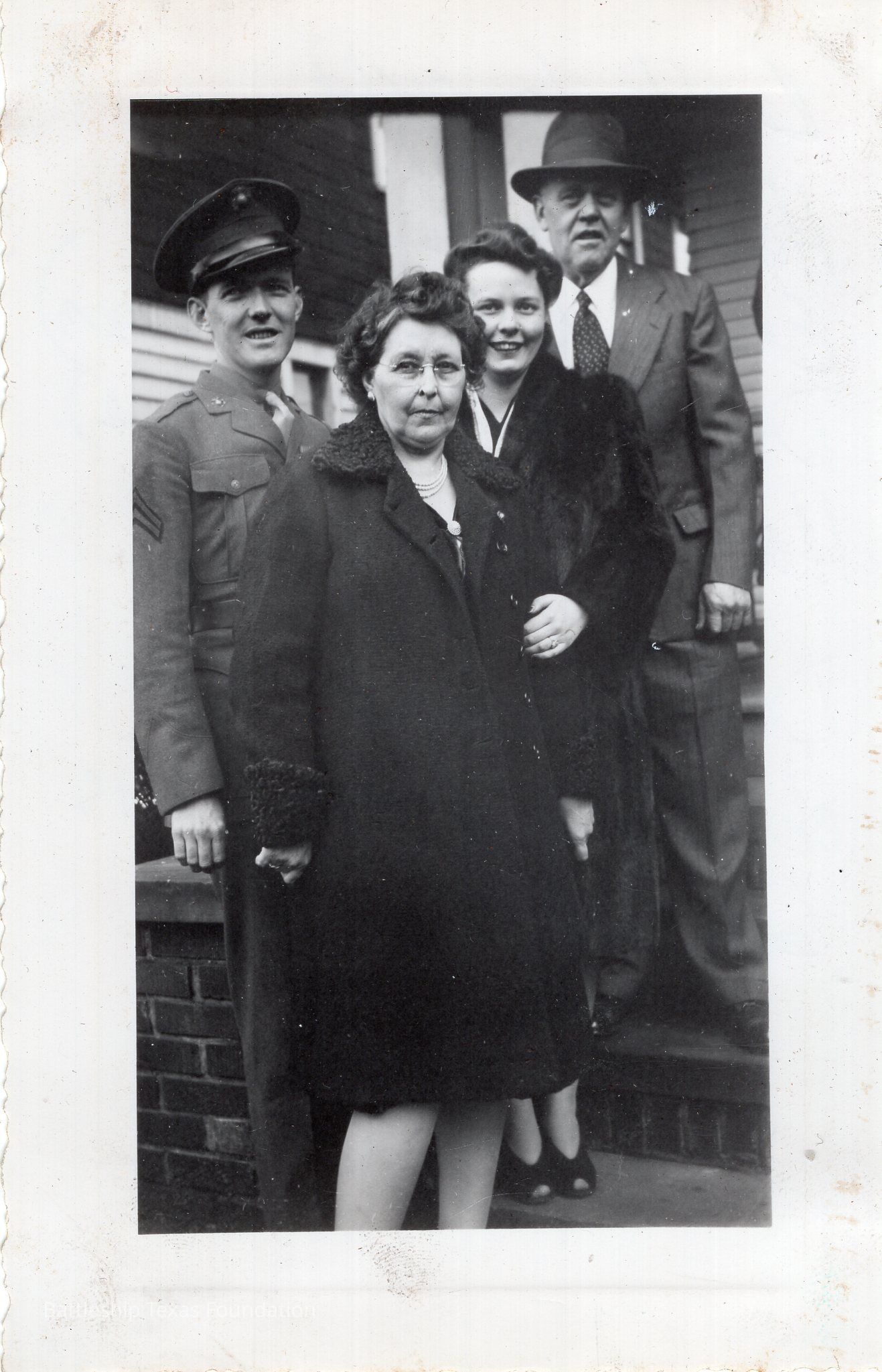 Four people pose on stairs in front of house, with pen writing on the back by Harold Nichols's son Steve Nichols. Left to Right: