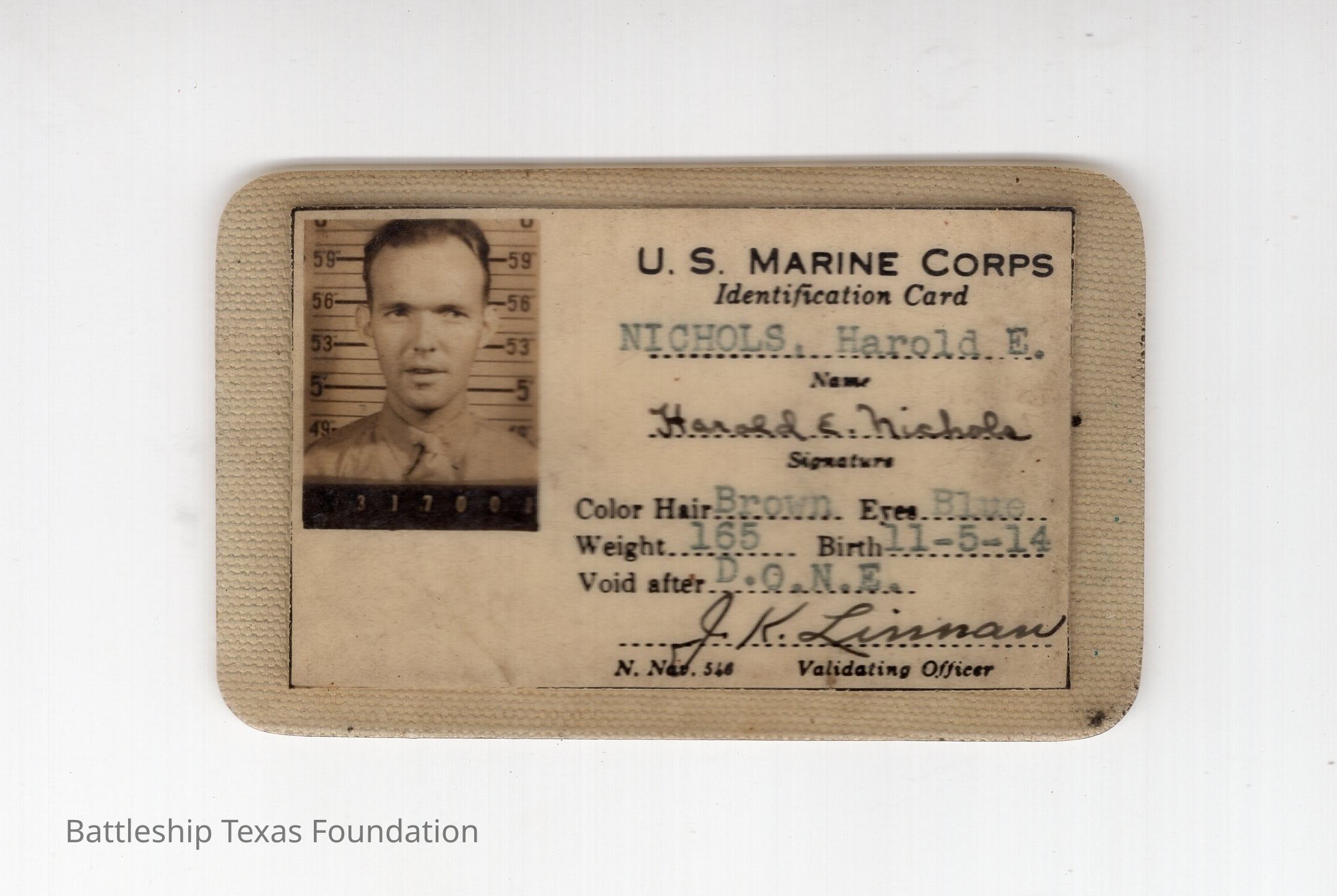 U.S. Marine Corps Identification Card for Harold E. Nichols and signed by validating officer. Card is a laminated piece of paper.Context