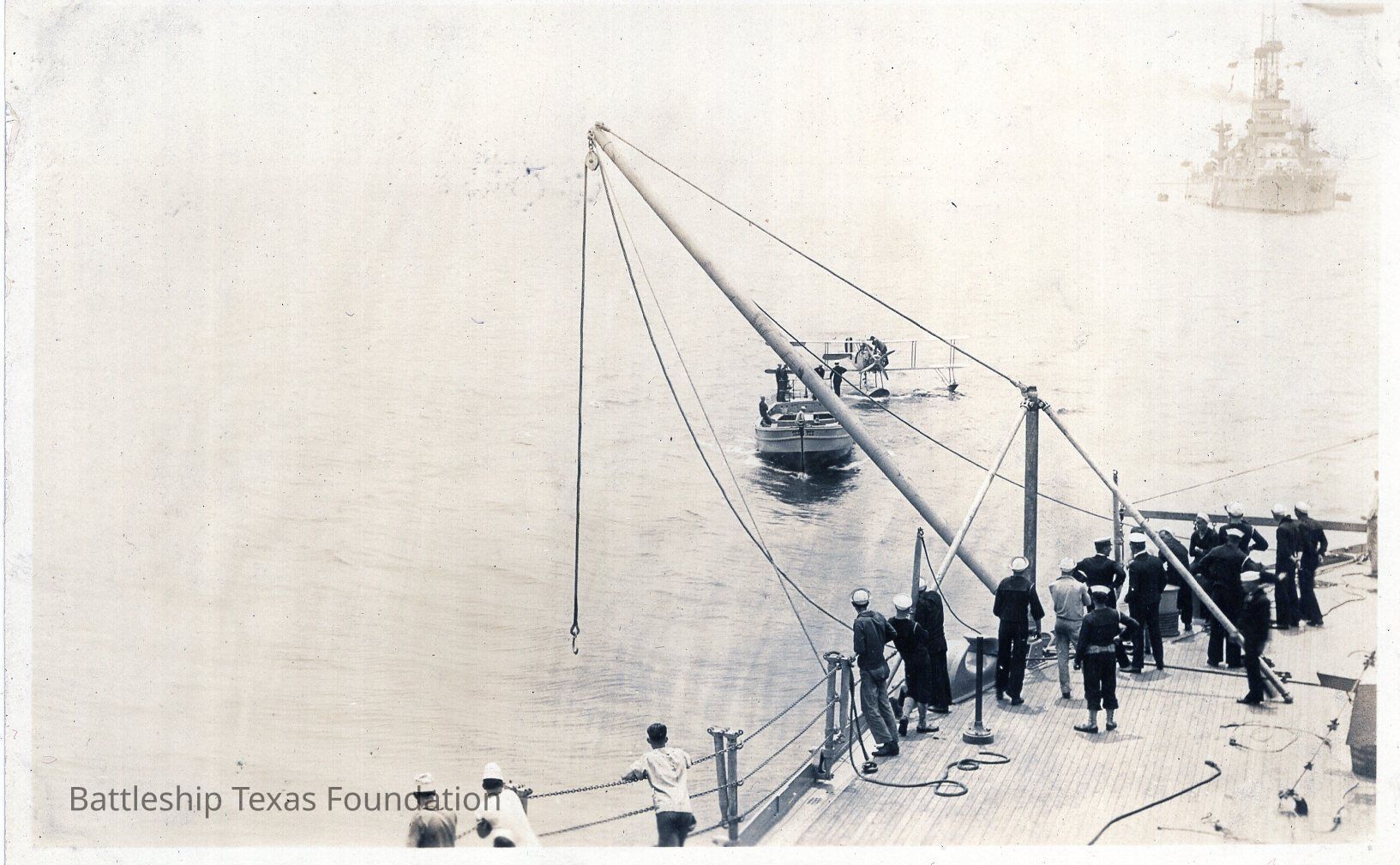 Photo shows several men standing near edge of deck with utility boat towing a sea plane. New York-class battleship in background.Context