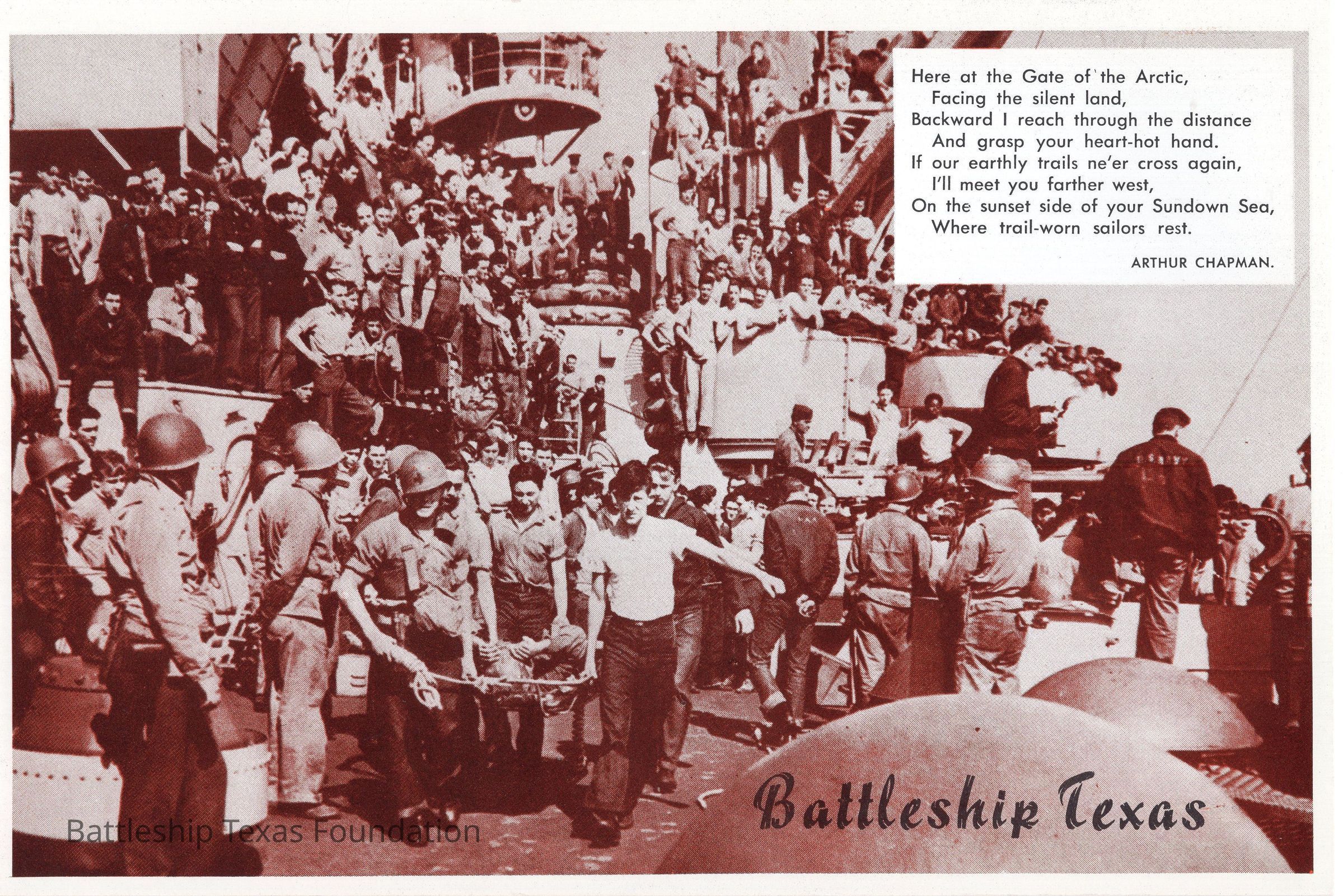 One of a set of twelve large postcards sold from the museum gift shop. Features men being taken into the ship off the coast of France, and a poem by Arthur Chapman.Context