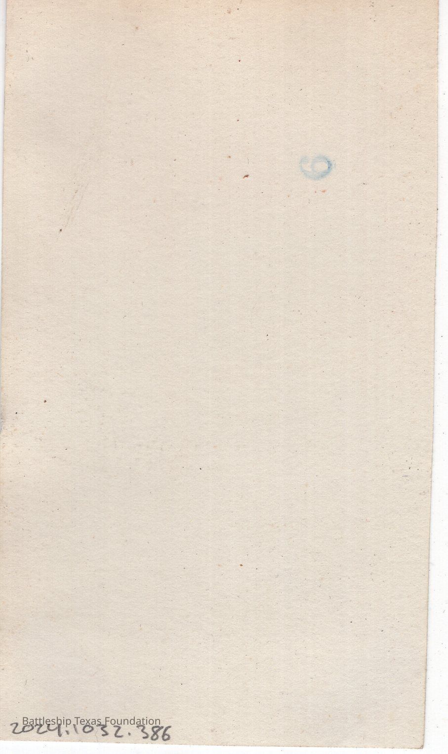 From a donated collection of individual photographs and pages out of a Texas crewmember's photo album. Items donated by the Los Angeles Maritime Museum.