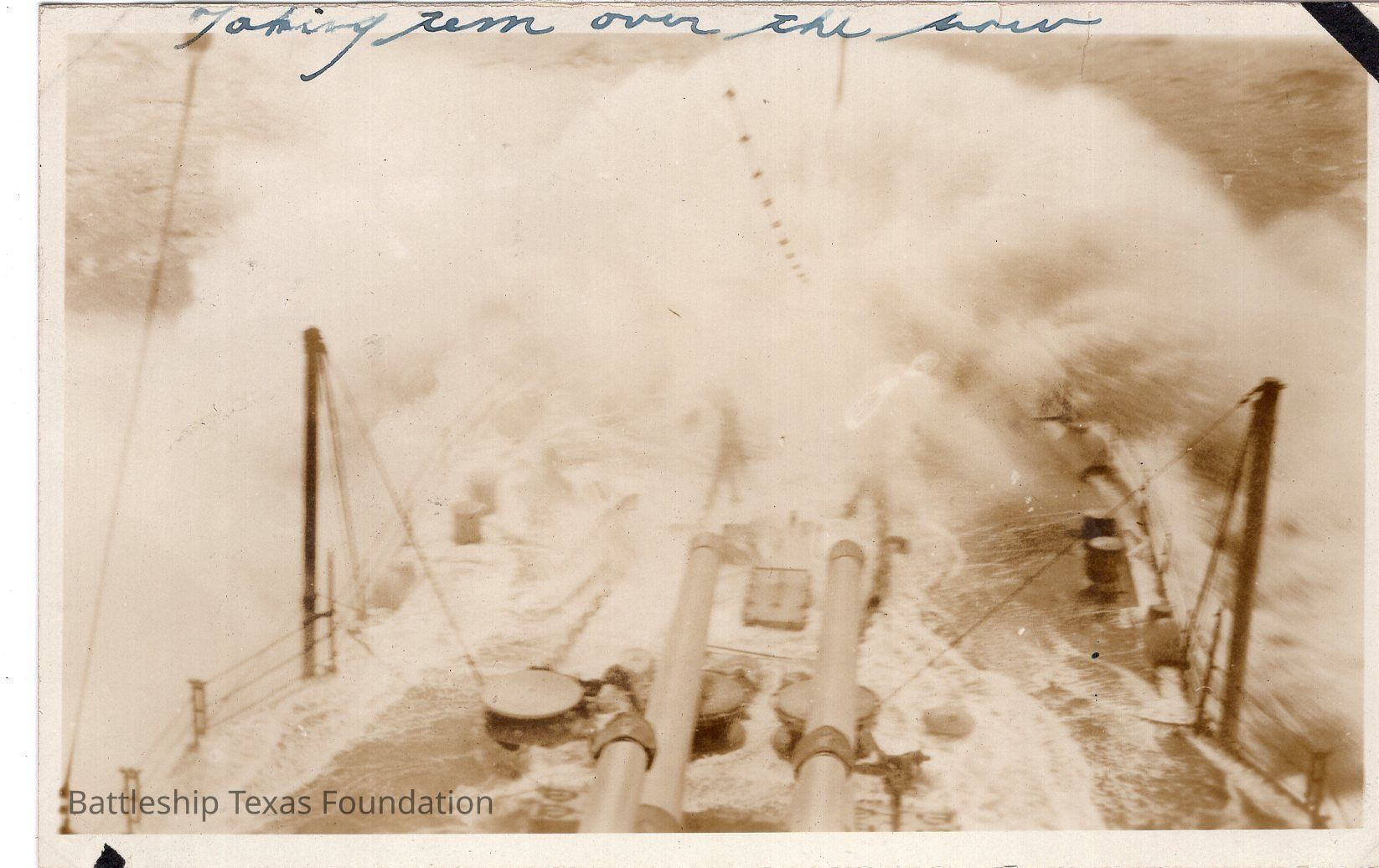 Features shot of large wave hitting bow of Texas. Front of bow beneath wave.Context