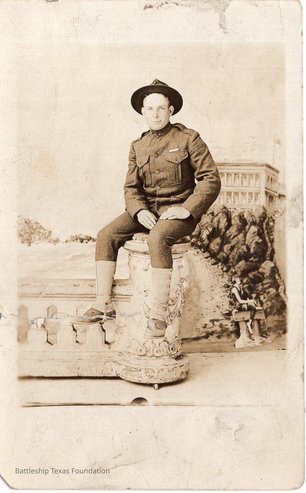 Hjalmer Johnson in Marine uniform sitting on stonework.