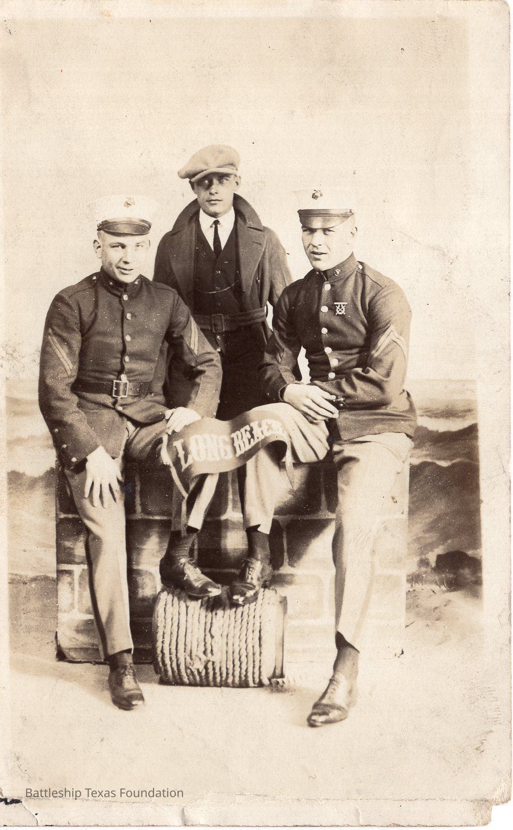 Johnson poses to the left, with another marine (right) and man (center) holding a Long Beach banner over their legs.Context