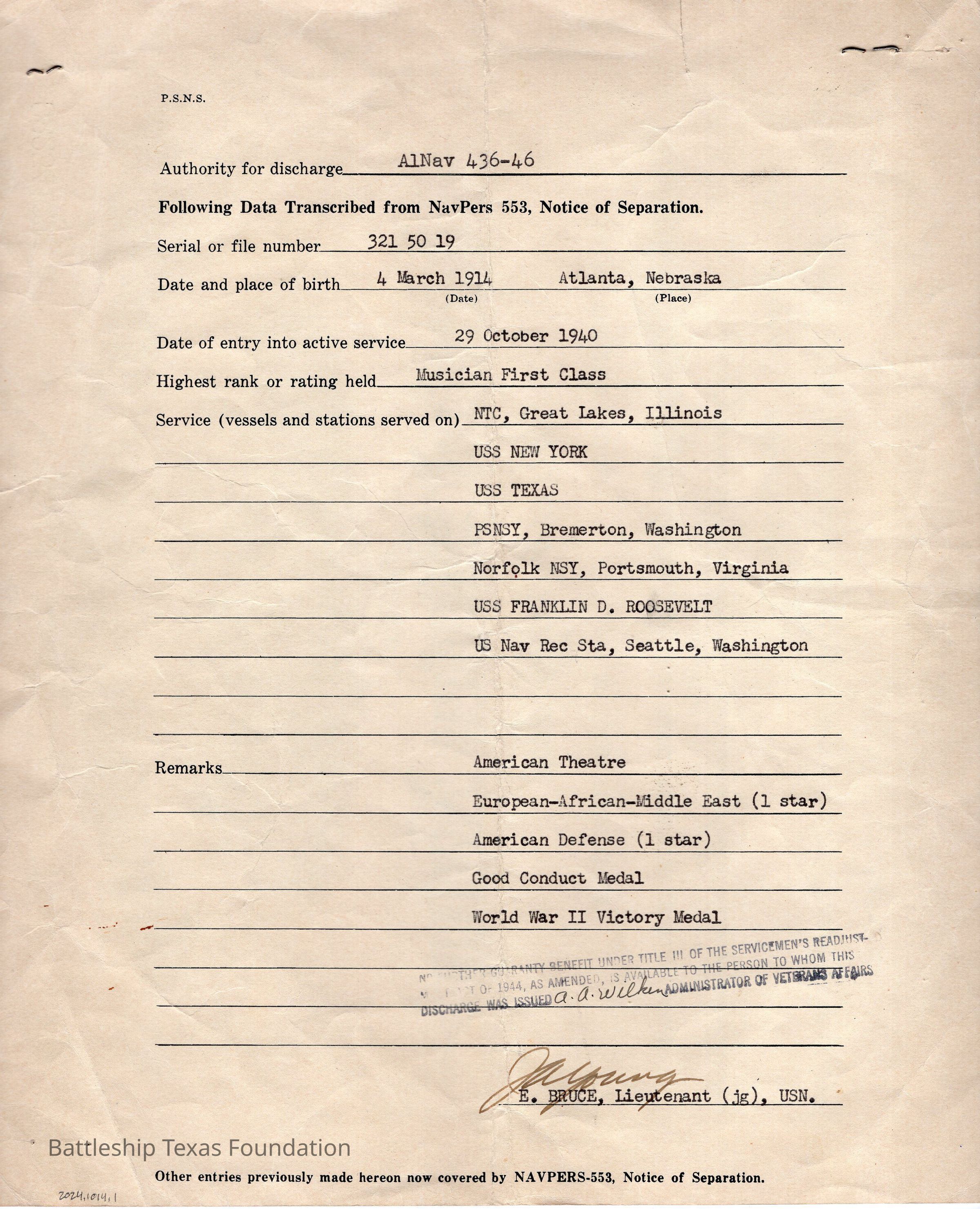 Robert Taylor served on both Battleship Texas, and her sister ship Battleship New York. He was a M1c and played the trumpet on both ships from late 1940 to July 1943, and elsewhere until his discharge in 1946.
