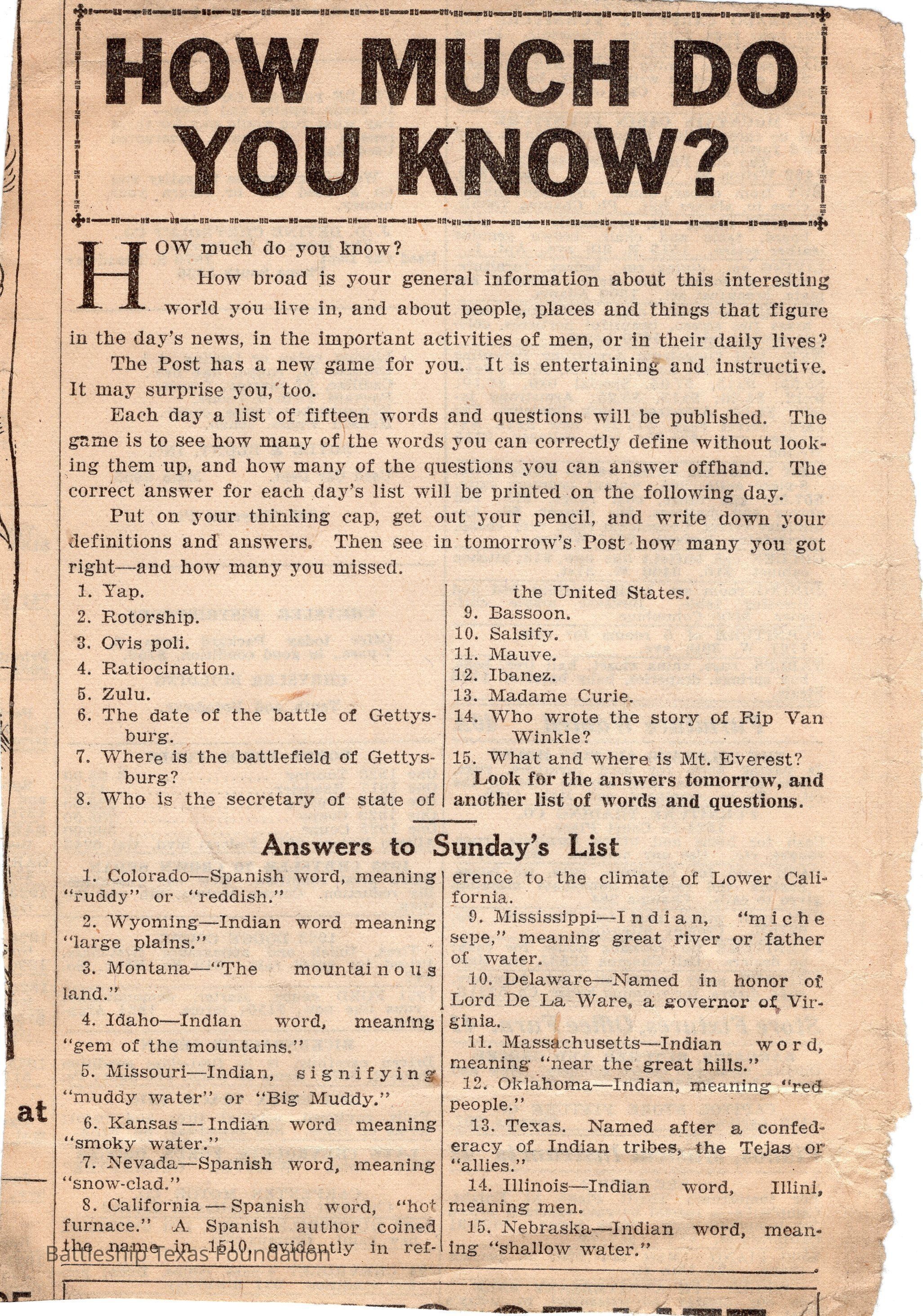 Lawrence Gaddis collected clippings from the Denver Post's segment "How Much Do You Know?" for at least twenty-nine days while a crew member of Battleship Texas.Collection