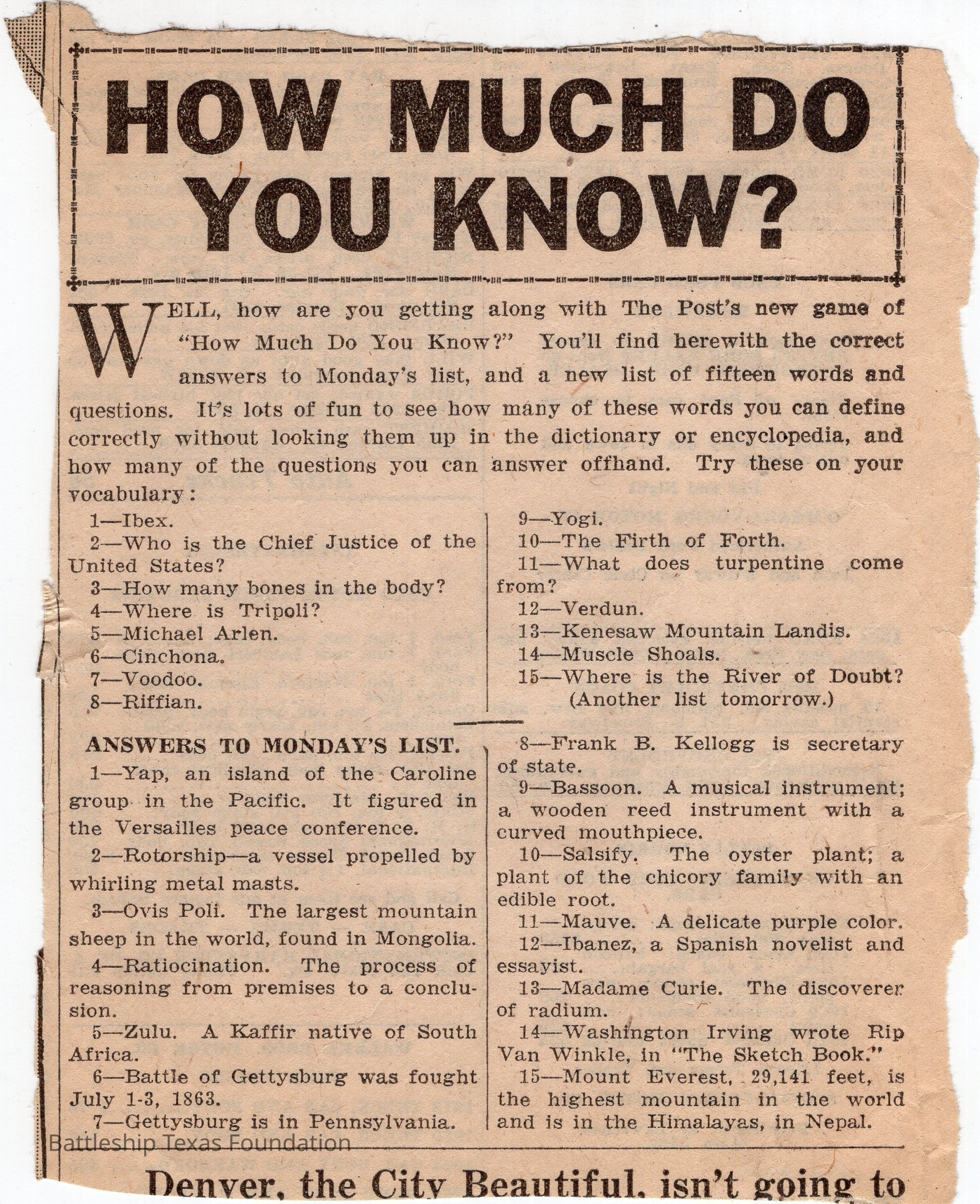 Lawrence Gaddis collected clippings from the Denver Post's segment "How Much Do You Know?" for at least twenty-nine days while a crew member of Battleship Texas.Collection