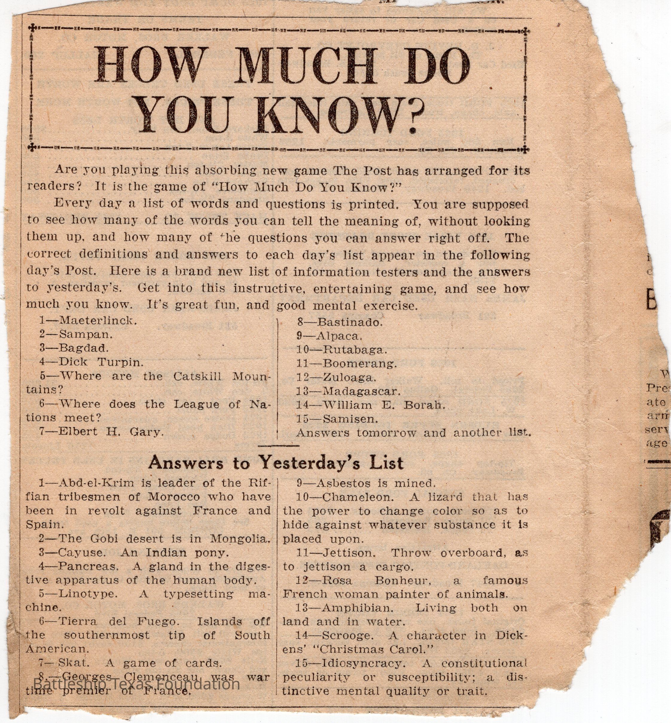 Lawrence Gaddis collected clippings from the Denver Post's segment "How Much Do You Know?" for at least twenty-nine days while a crew member of Battleship Texas.Collection