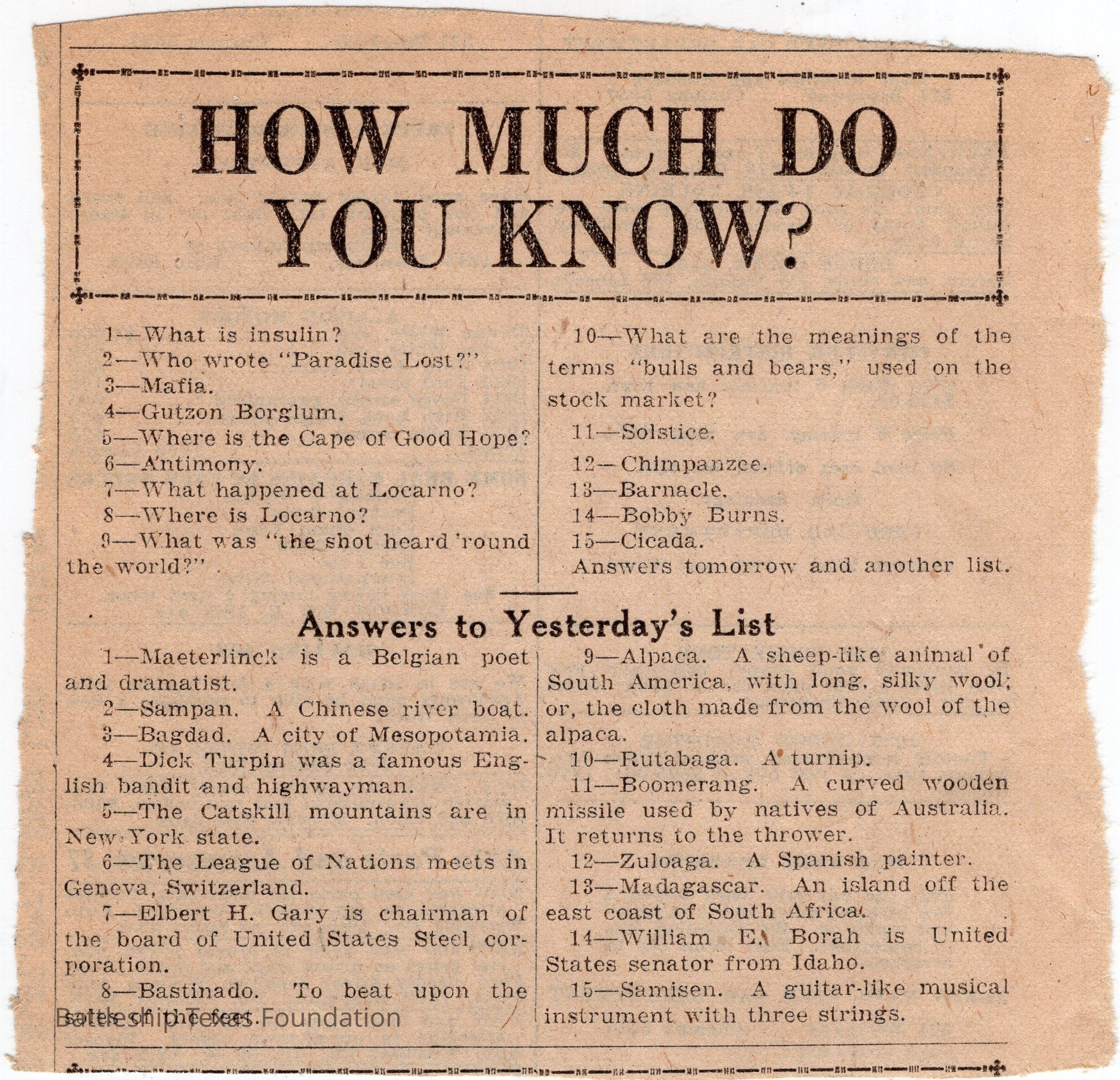 Lawrence Gaddis collected clippings from the Denver Post's segment "How Much Do You Know?" for at least twenty-nine days while a crew member of Battleship Texas.Collection