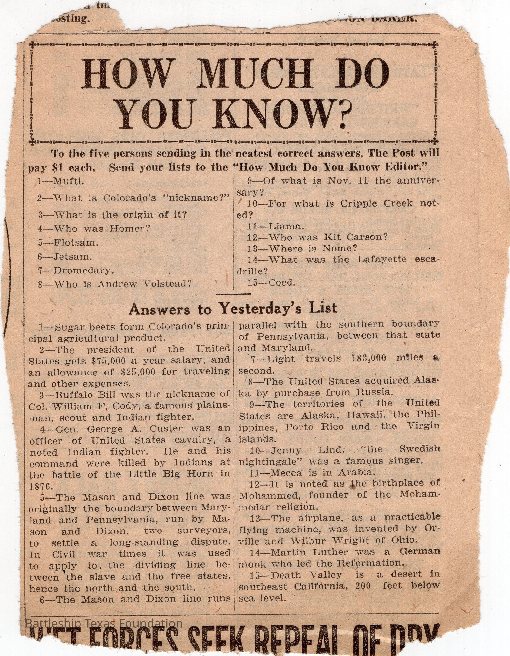 Lawrence Gaddis collected clippings from the Denver Post's segment "How Much Do You Know?" for at least twenty-nine days while a crew member of Battleship Texas.Collection