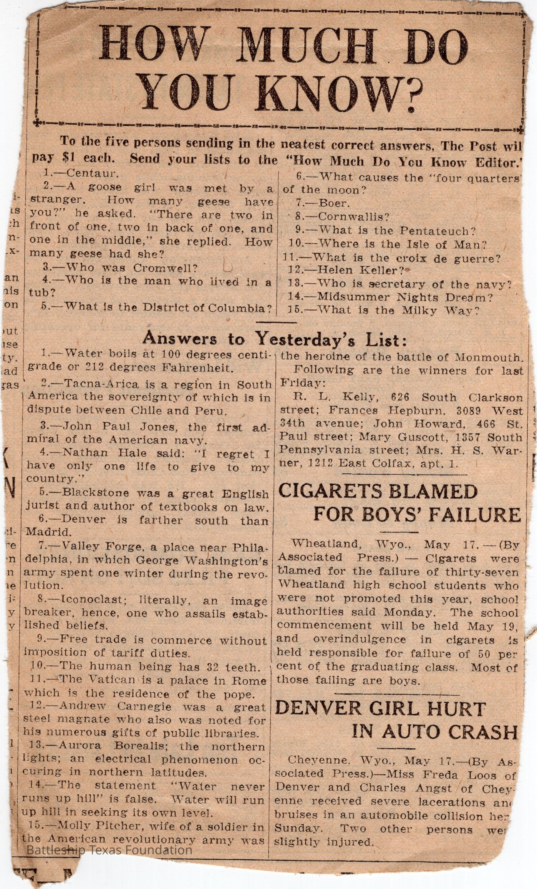 Lawrence Gaddis collected clippings from the Denver Post's segment "How Much Do You Know?" for at least twenty-nine days while a crew member of Battleship Texas.Collection
