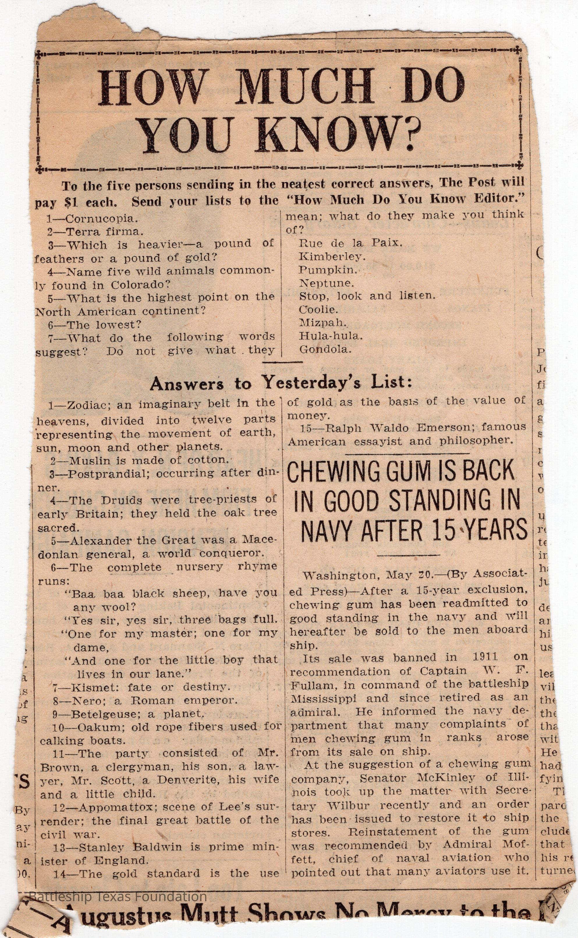 Lawrence Gaddis collected clippings from the Denver Post's segment "How Much Do You Know?" for at least twenty-nine days while a crew member of Battleship Texas.Collection