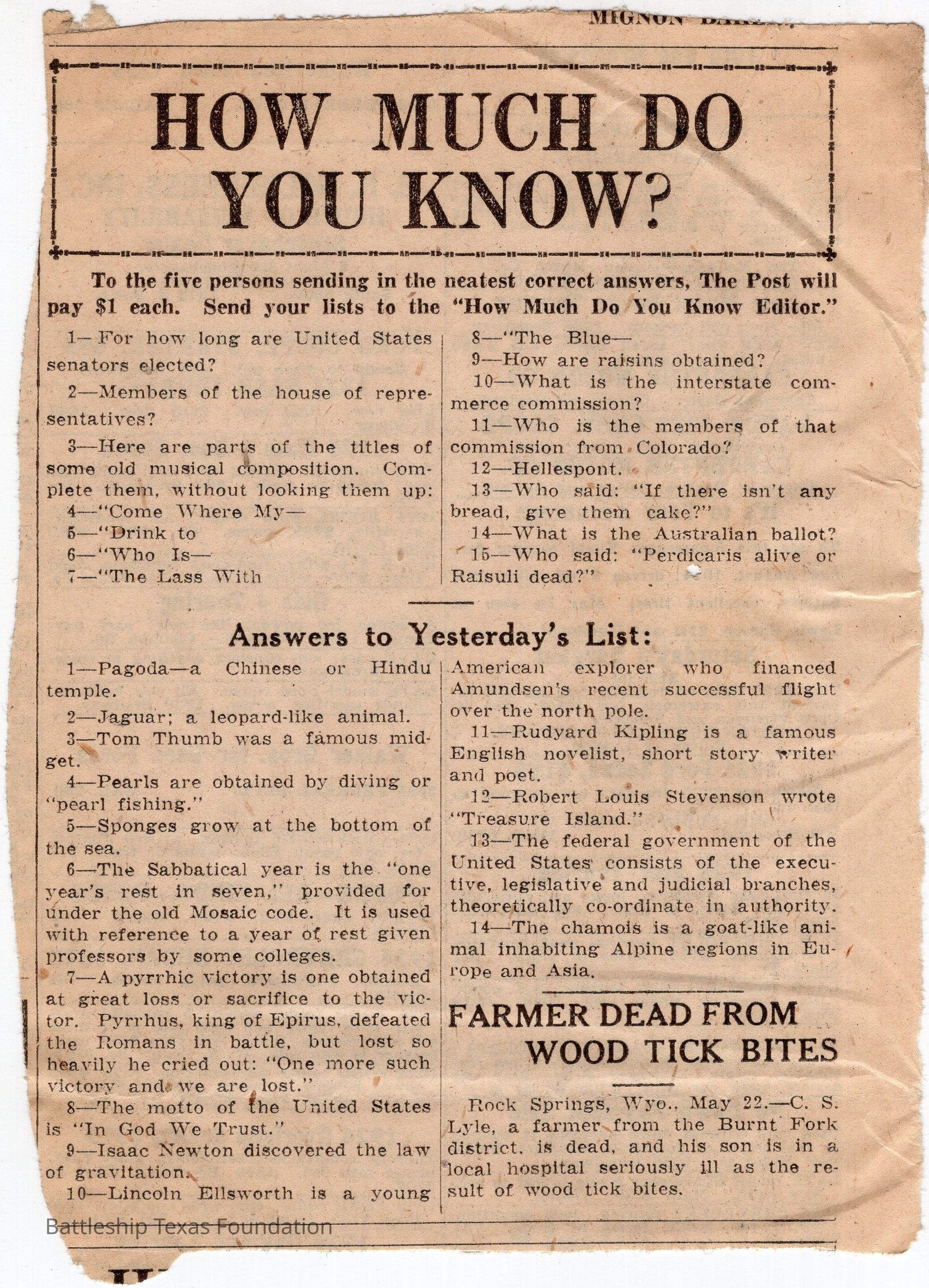 Lawrence Gaddis collected clippings from the Denver Post's segment "How Much Do You Know?" for at least twenty-nine days while a crew member of Battleship Texas.Collection