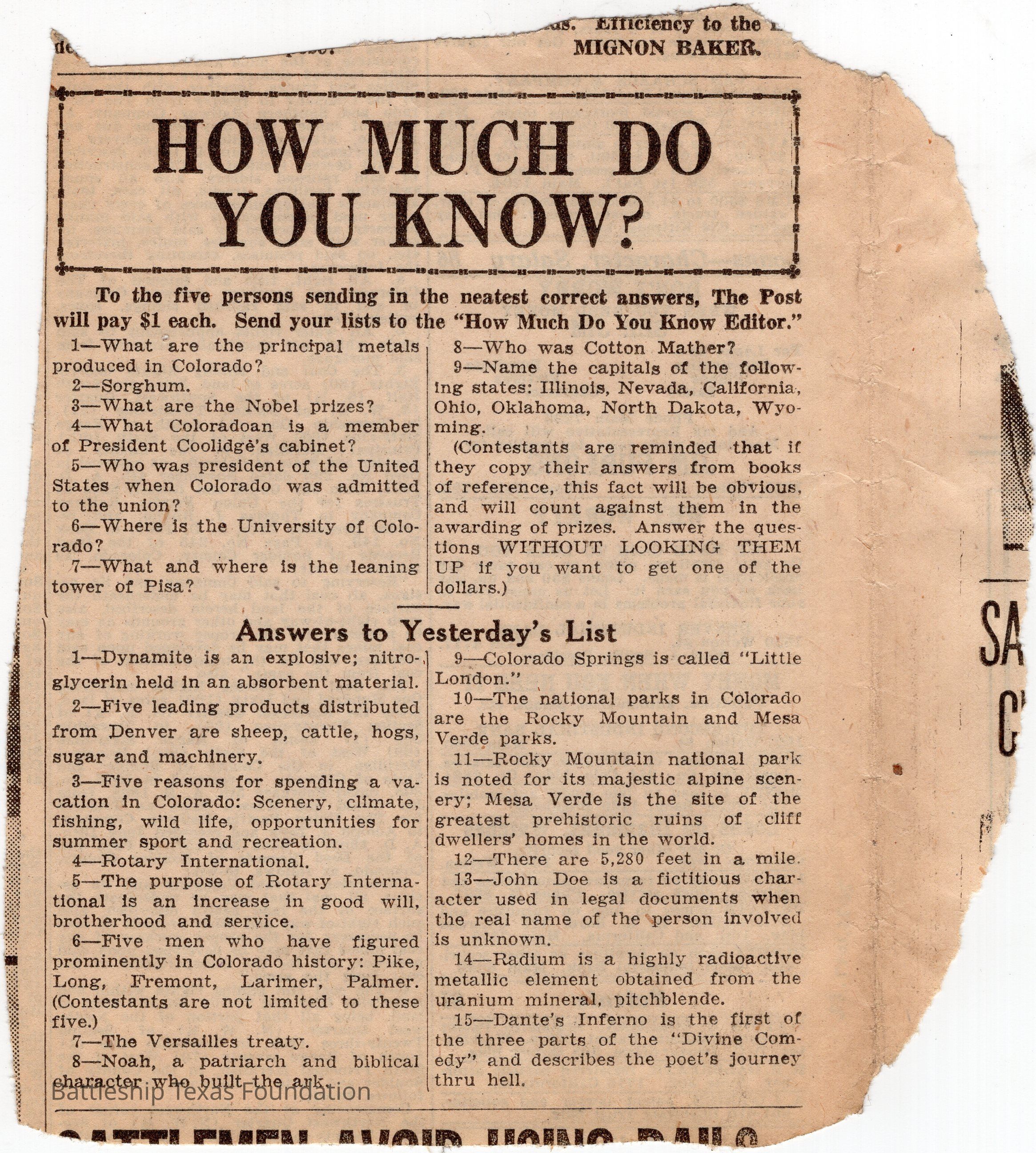 Lawrence Gaddis collected clippings from the Denver Post's segment "How Much Do You Know?" for at least twenty-nine days while a crew member of Battleship Texas.Collection