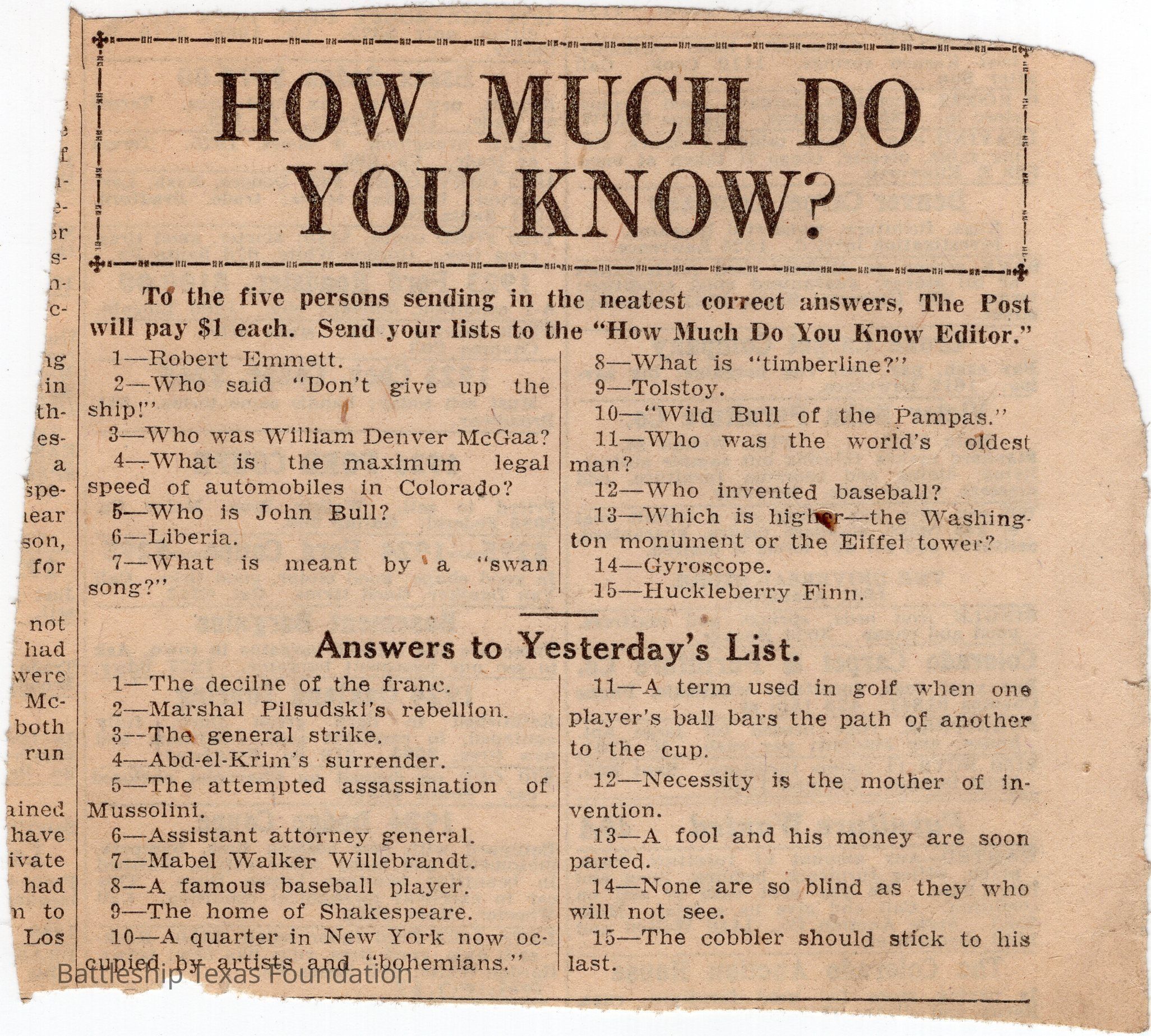 Lawrence Gaddis collected clippings from the Denver Post's segment "How Much Do You Know?" for at least twenty-nine days while a crew member of Battleship Texas.Collection