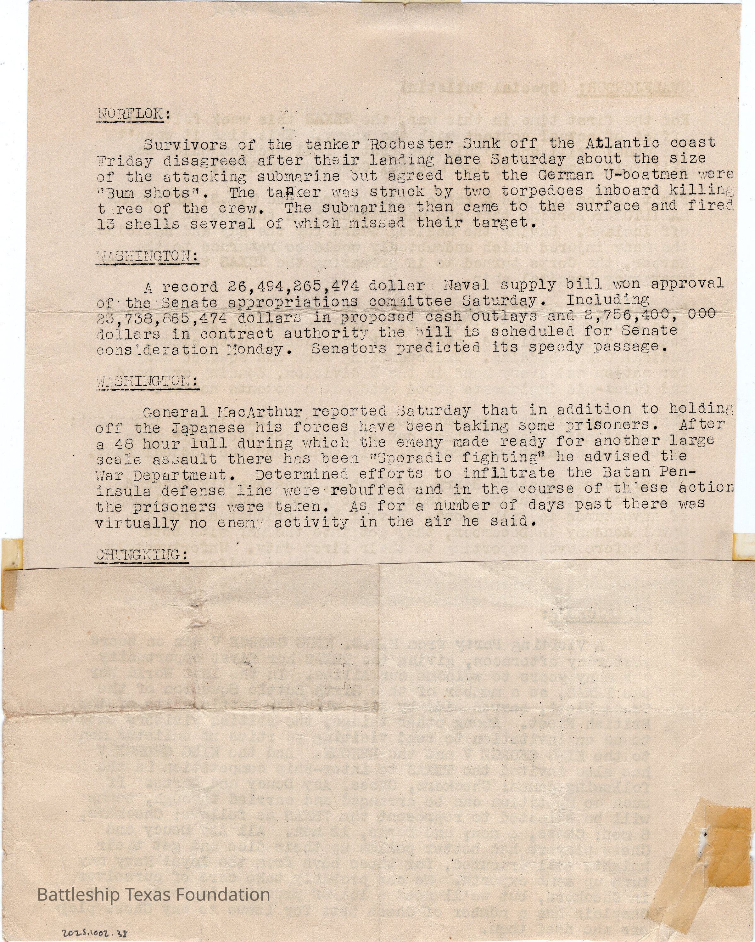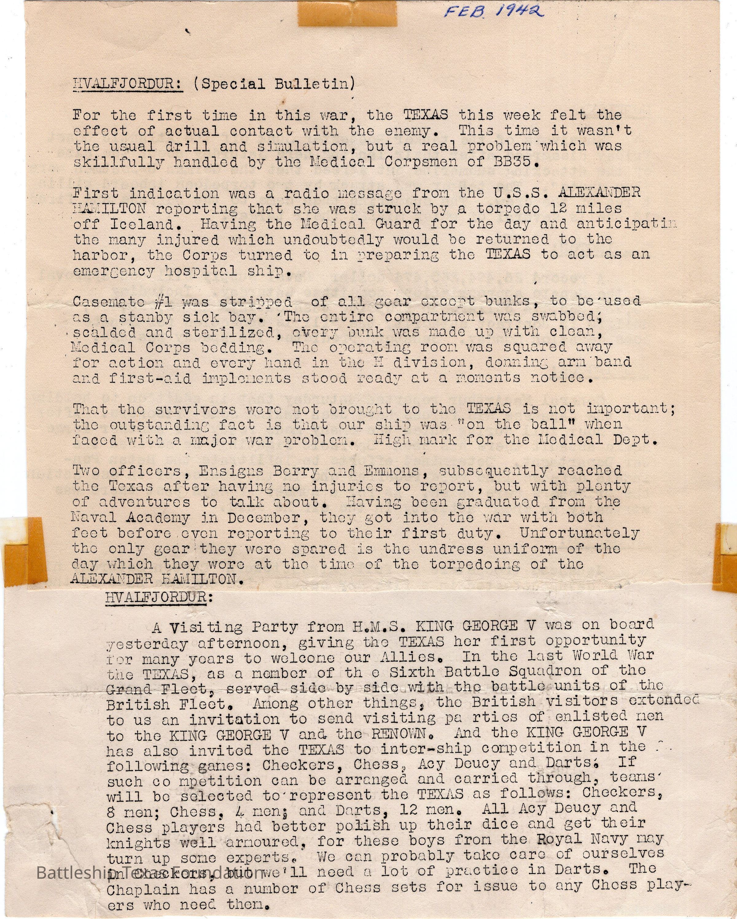 Two notices taped together by Howard Flood. Special bulletin describing the ships actions as an emergency hospital ship, and of visitors from the British Navy.Context