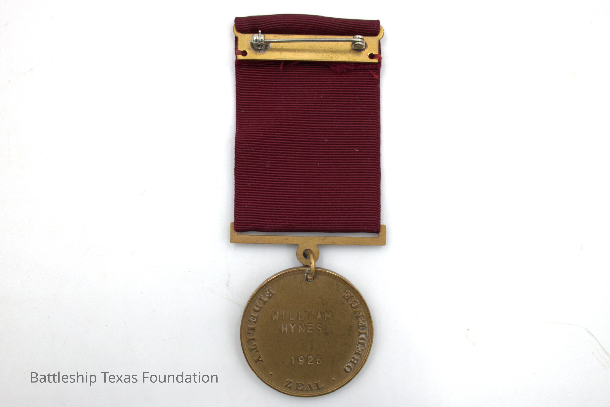 Medal awarded to William Hynes in 1925. Red fabric with USS Constitution circled in rope.Context