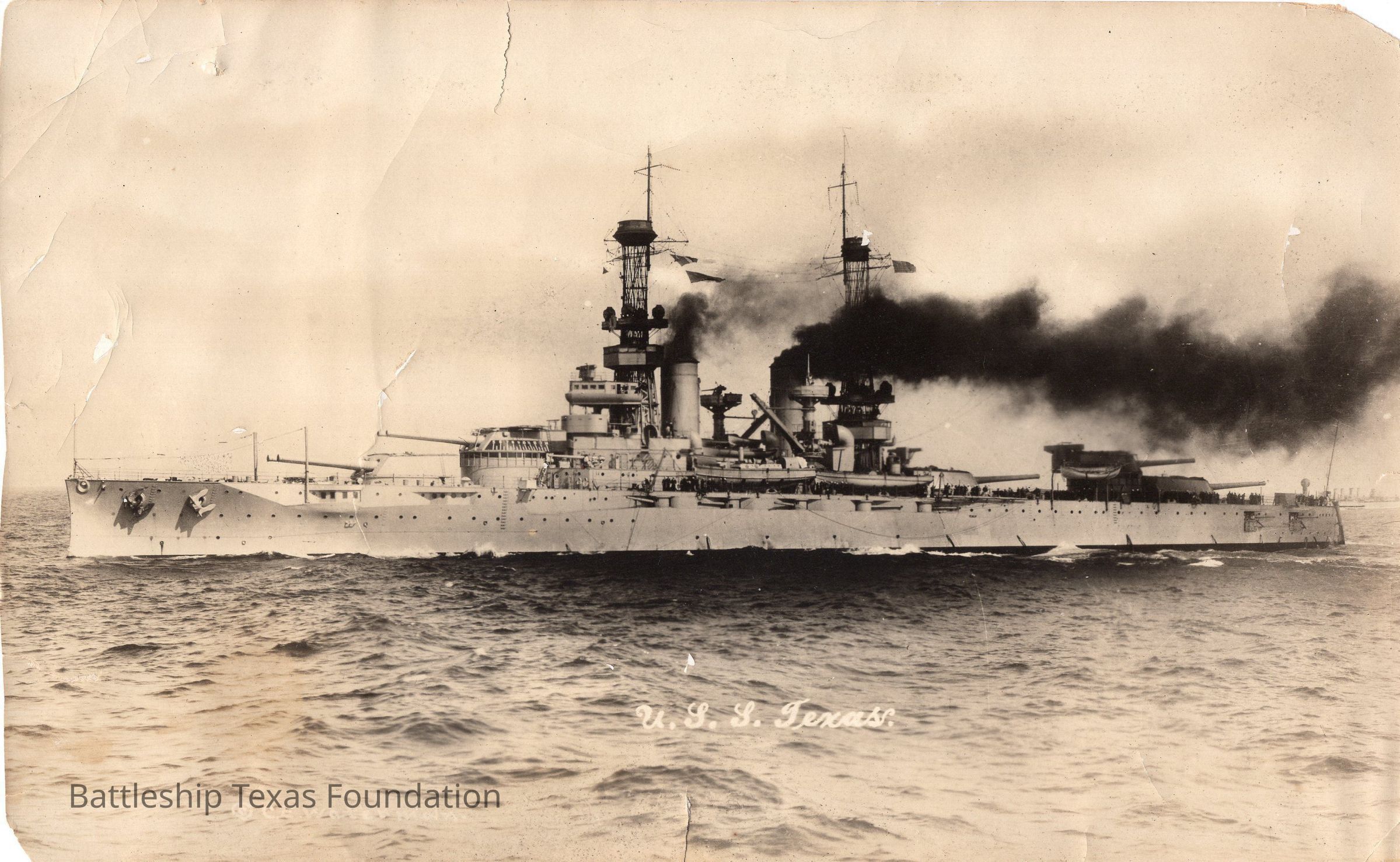 Texas with cage masts, smoke wafting aft, "U.S.S. Texas" printed on bottom
