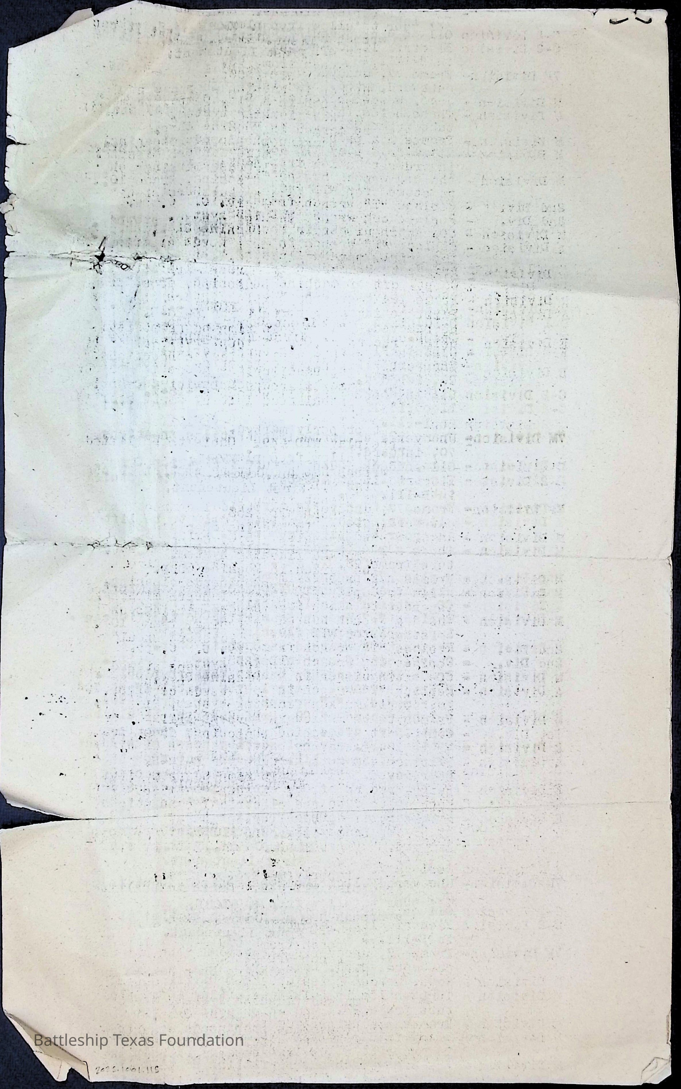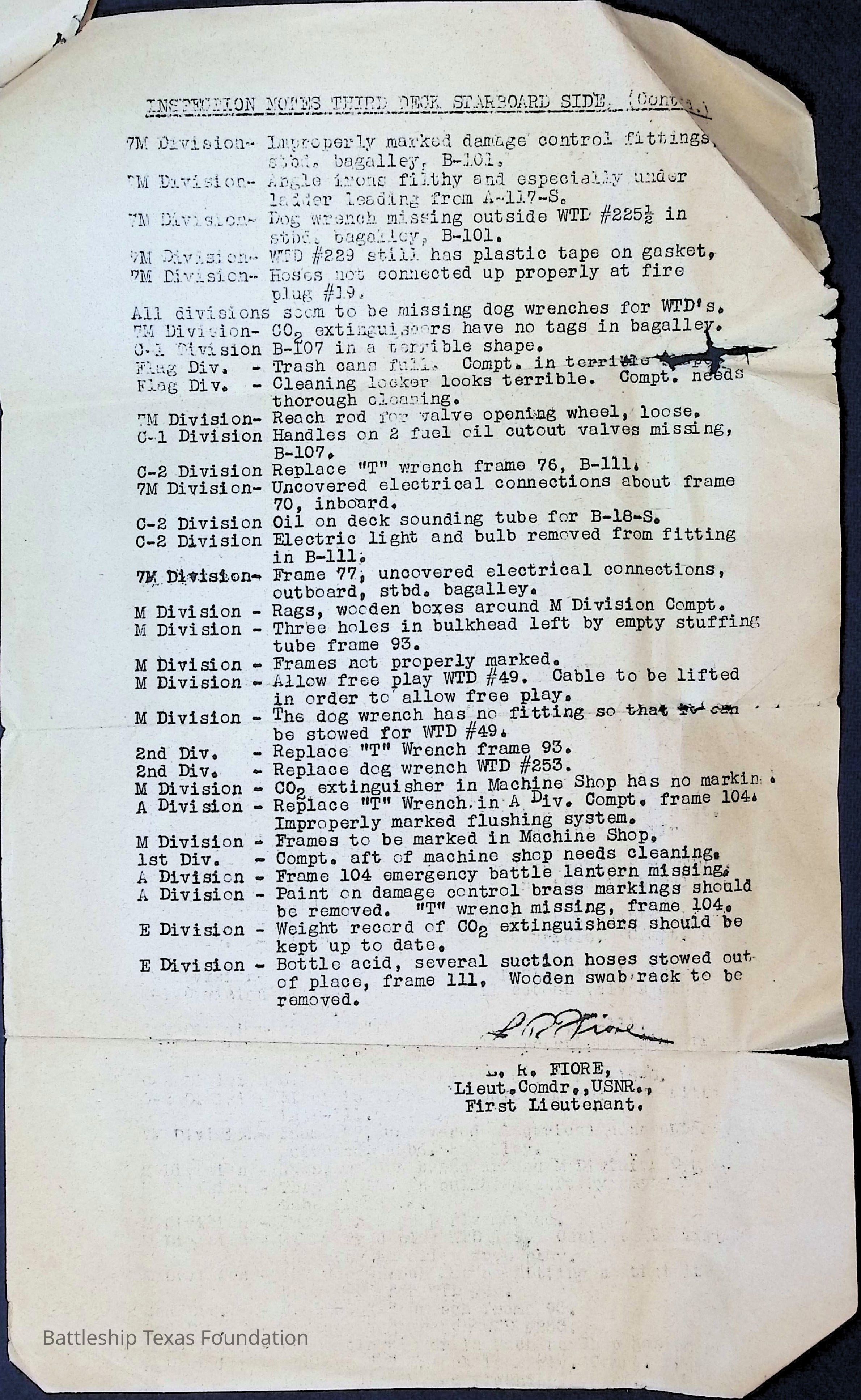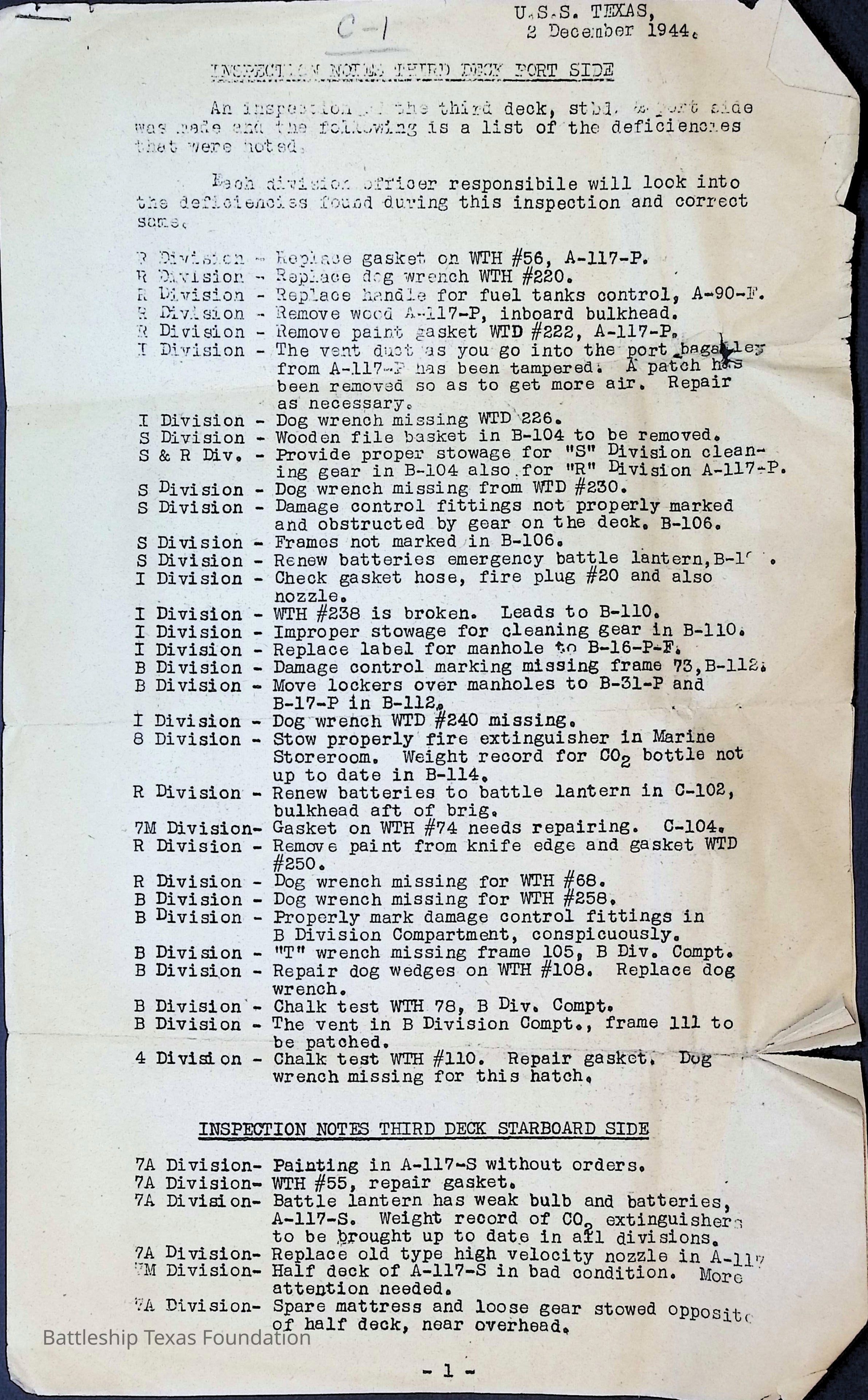 Inspection notes for the port side of third deck. Two pages stapled together with printing only on the front side of each page.Context