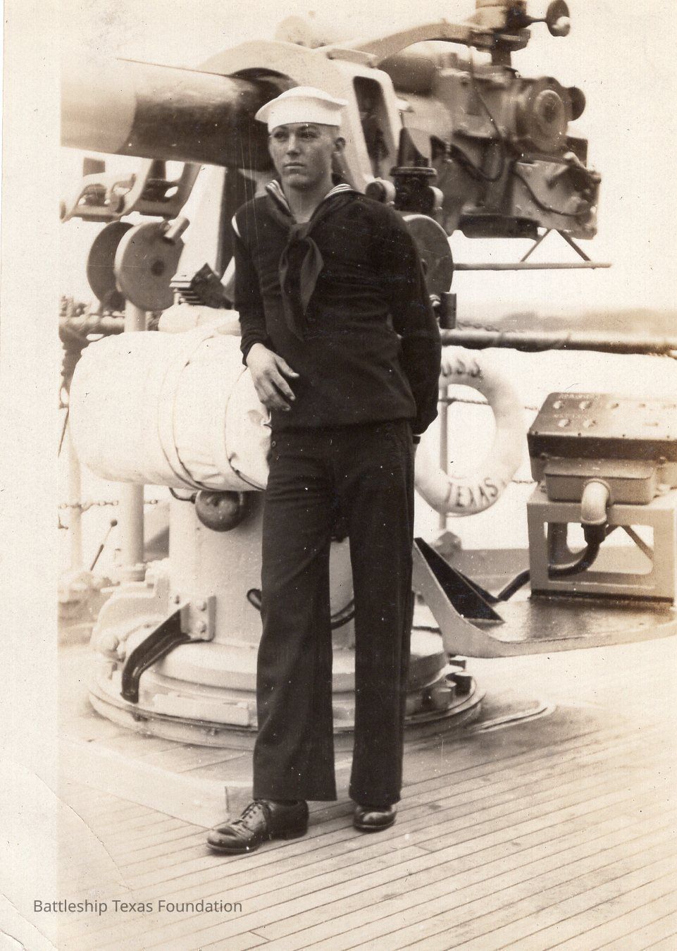 Man stands next to 3"/50cal. Back labeled JM Coleman.Context