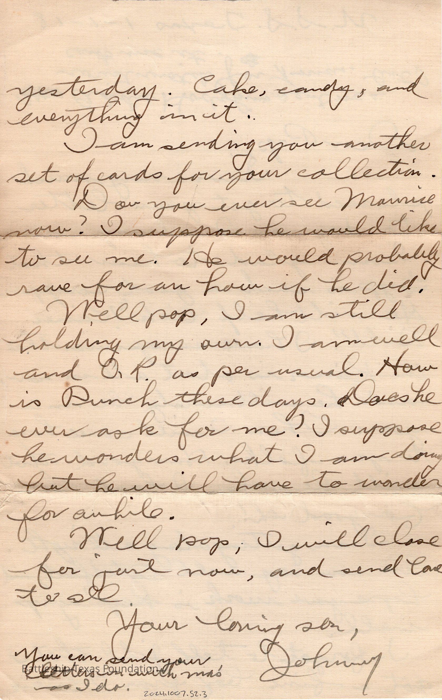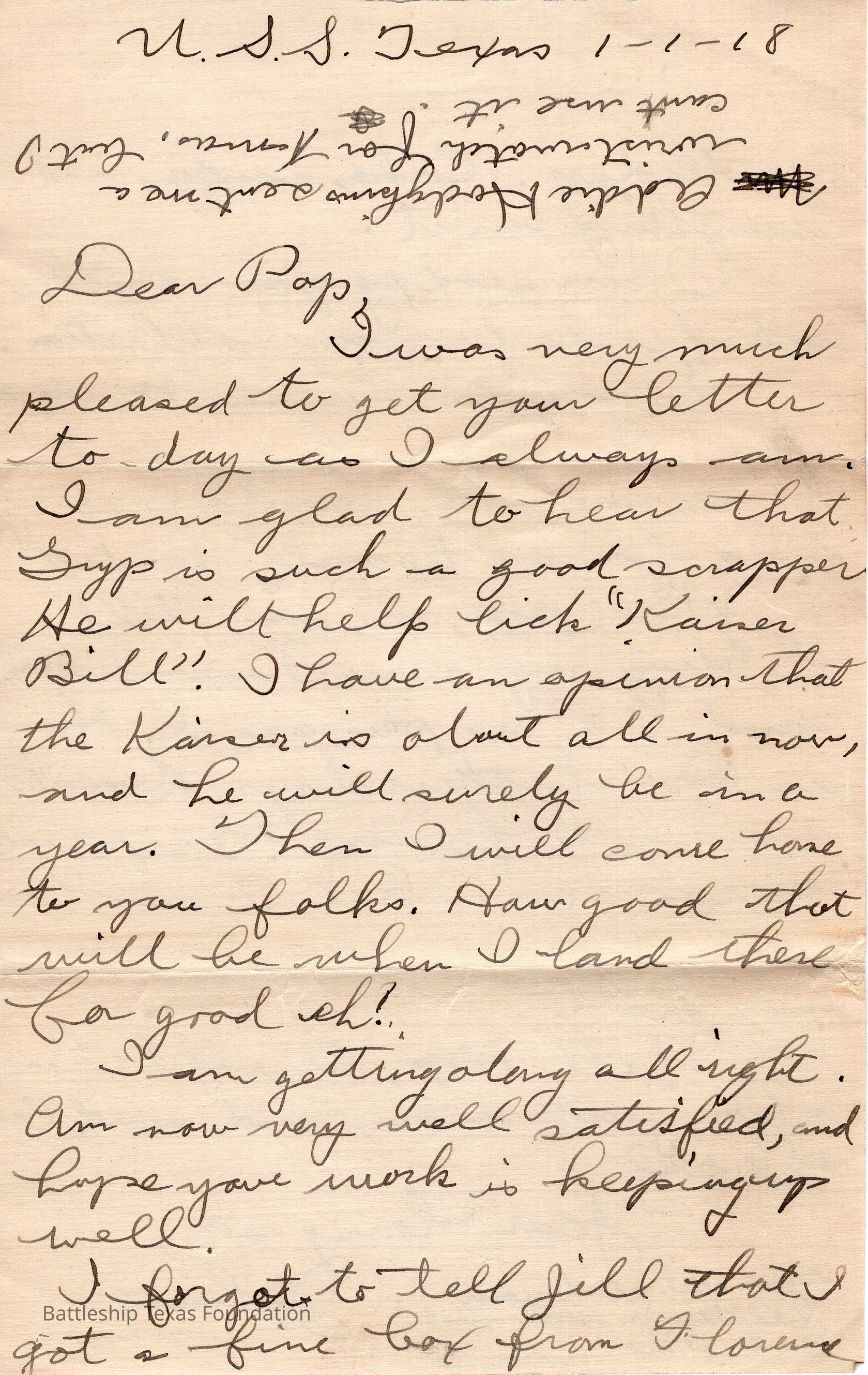 Letter dated 1-1-18 with "U.S.S. Texas" written on the top and addressed to Pop. Three lines written upside down at top of front page.Context