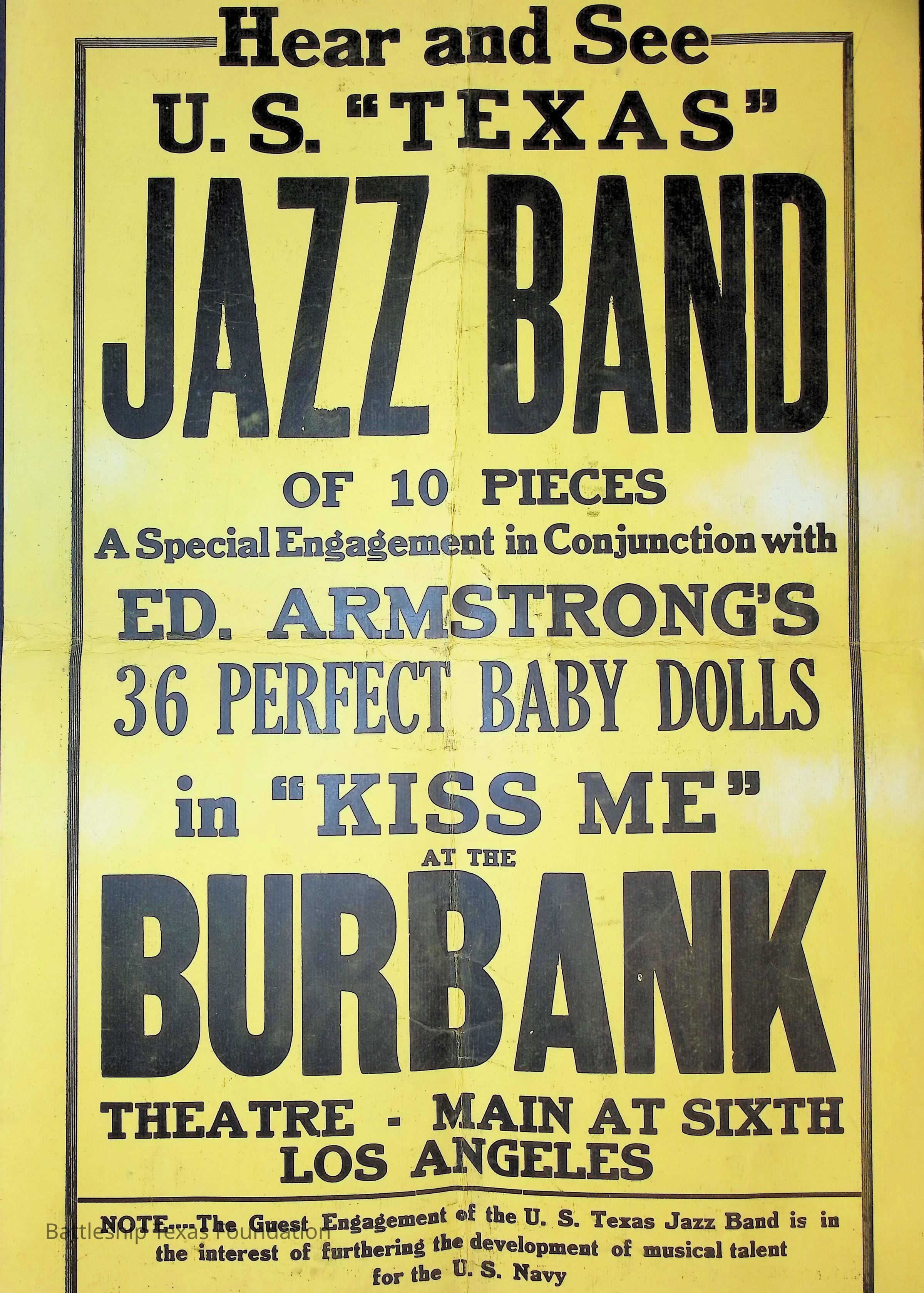 Yellow Jazz band concert poster with black lettering. U.S. "Texas" band performing the concert to further develop musical talent in the USN, according to the note on the bottom.Context
