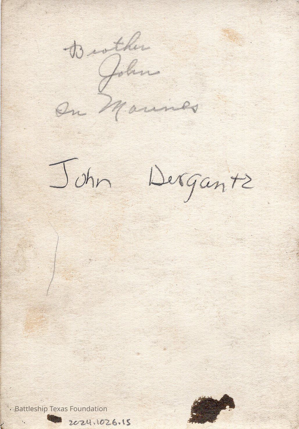 Photo of John Dergantz in uniform. Back reads "Brother John on Marines John Dergantz"