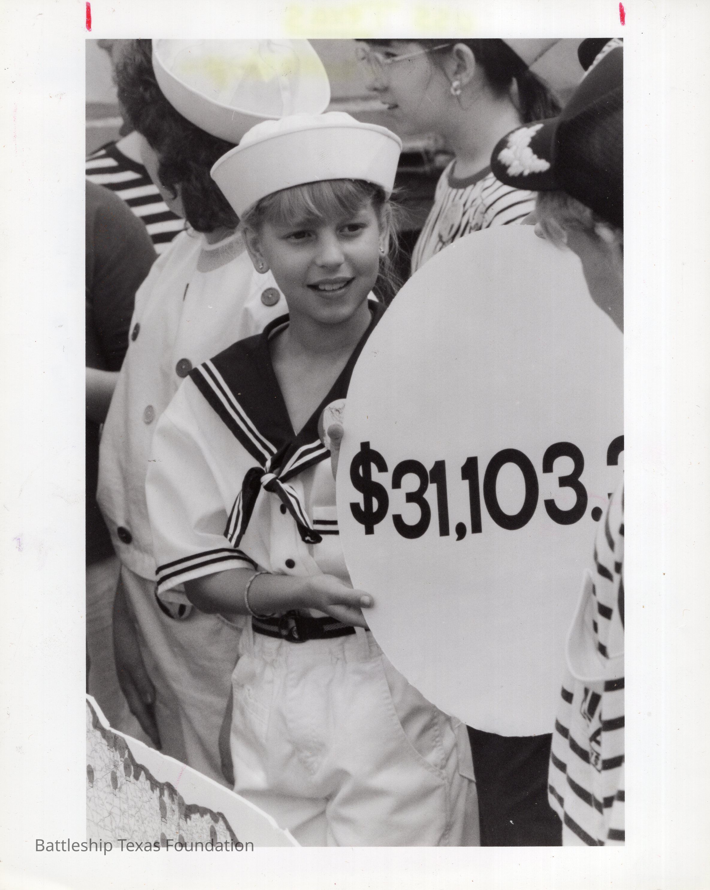 Joy Roper, 11 years old, holds up a sign reading "$31,103" for how much her class raised for the museum in April 1988.Context