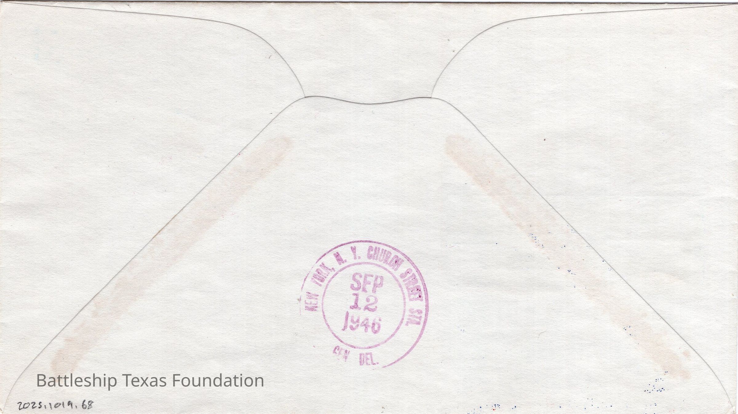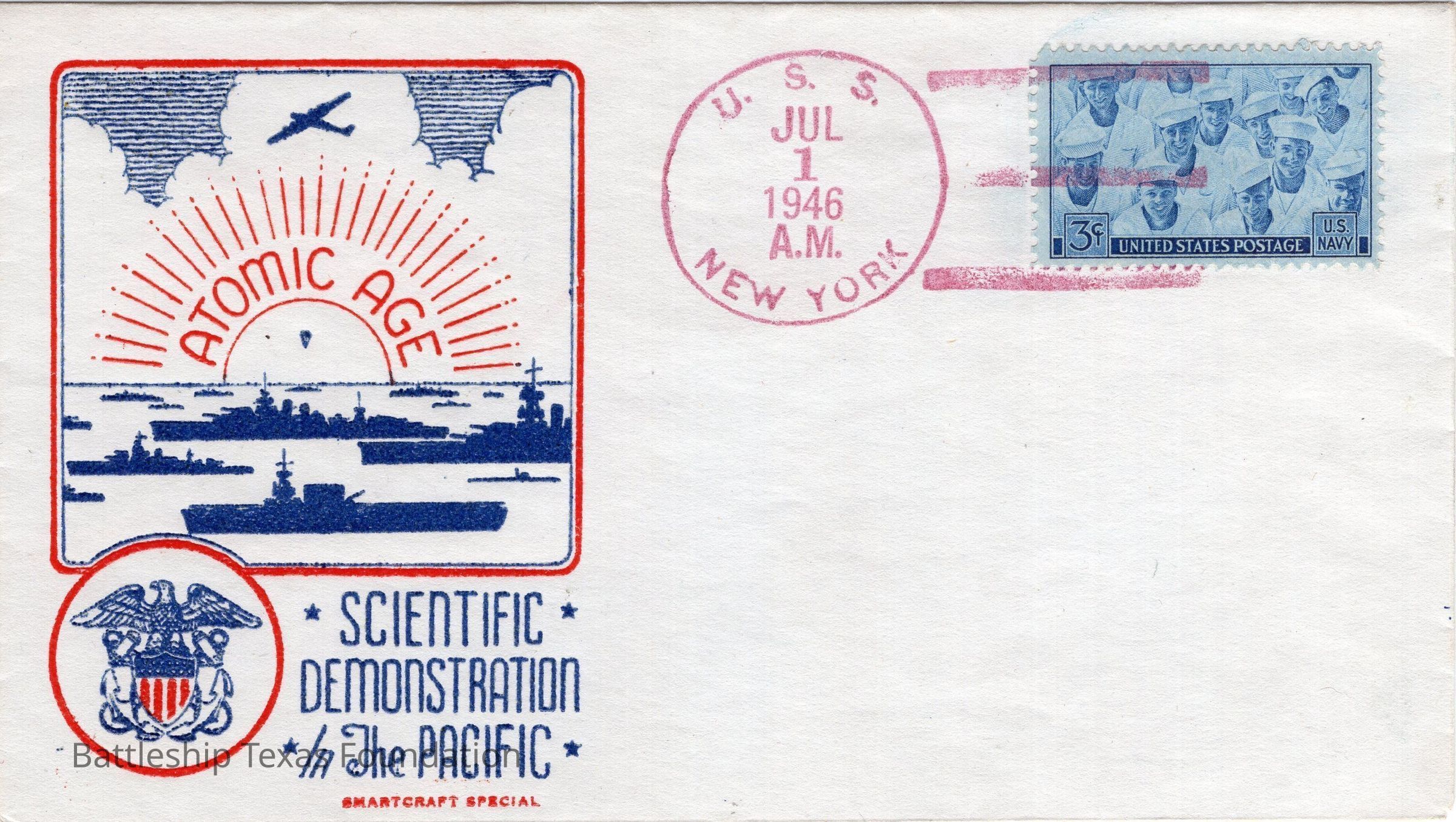 Envelope sent from USS New York on the morning of July 1, 1946, when the ship was in Bikini Atoll for Operation Crossroads. Features an ATOMIC AGE stamp with a fleet silhouette, a US seal beneath, and the caption "Scientific Demonstration in the Pacific."Context