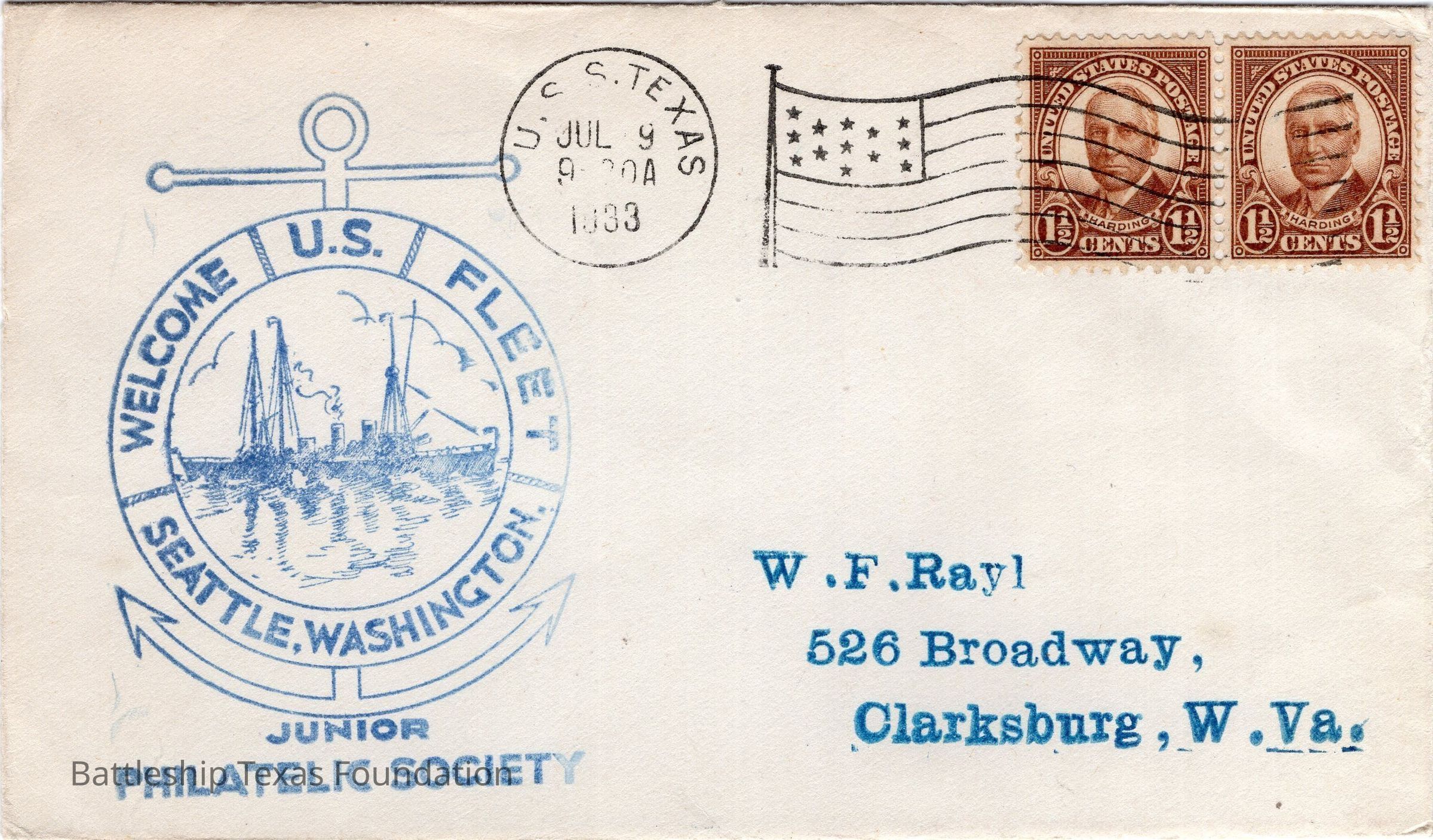 Addressed to W.F. Rayl. Envelope sent from USS Texas on the morning of July 9, 1933 from Seattle, Washington. Features a stamp of a life saver with the image of a ship on water in the center, "WELCOME U.S. FLEET SEATTLE, WASHINGTON" around the circumference, with an anchor in the background, and labelled for the Junior Philatelic Society.Context
