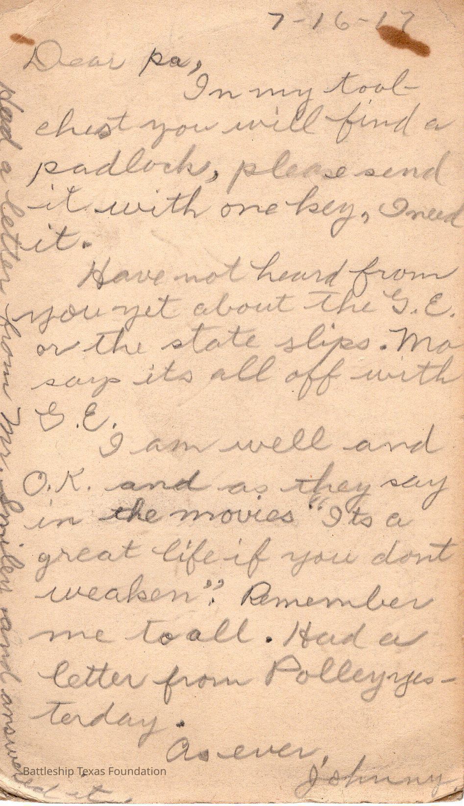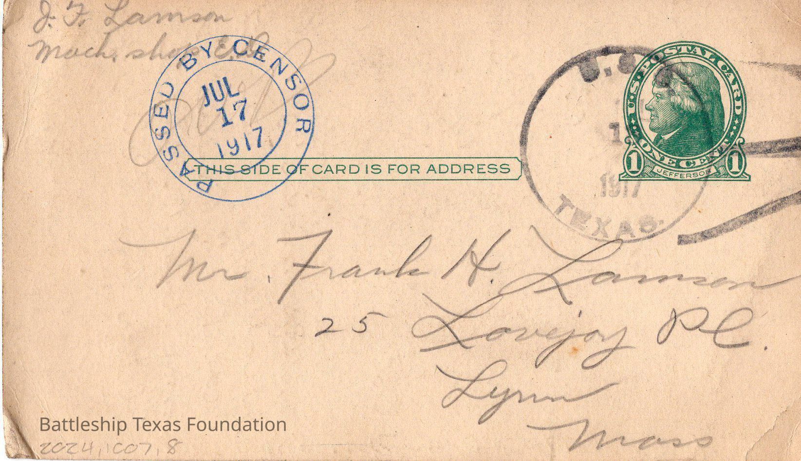 One green Jefferson stamp with USS TEXAS stamped over it. "PASSED BY CENSOR JUL 17, 1917" on top left. Addressed to Mr. Frank.Context