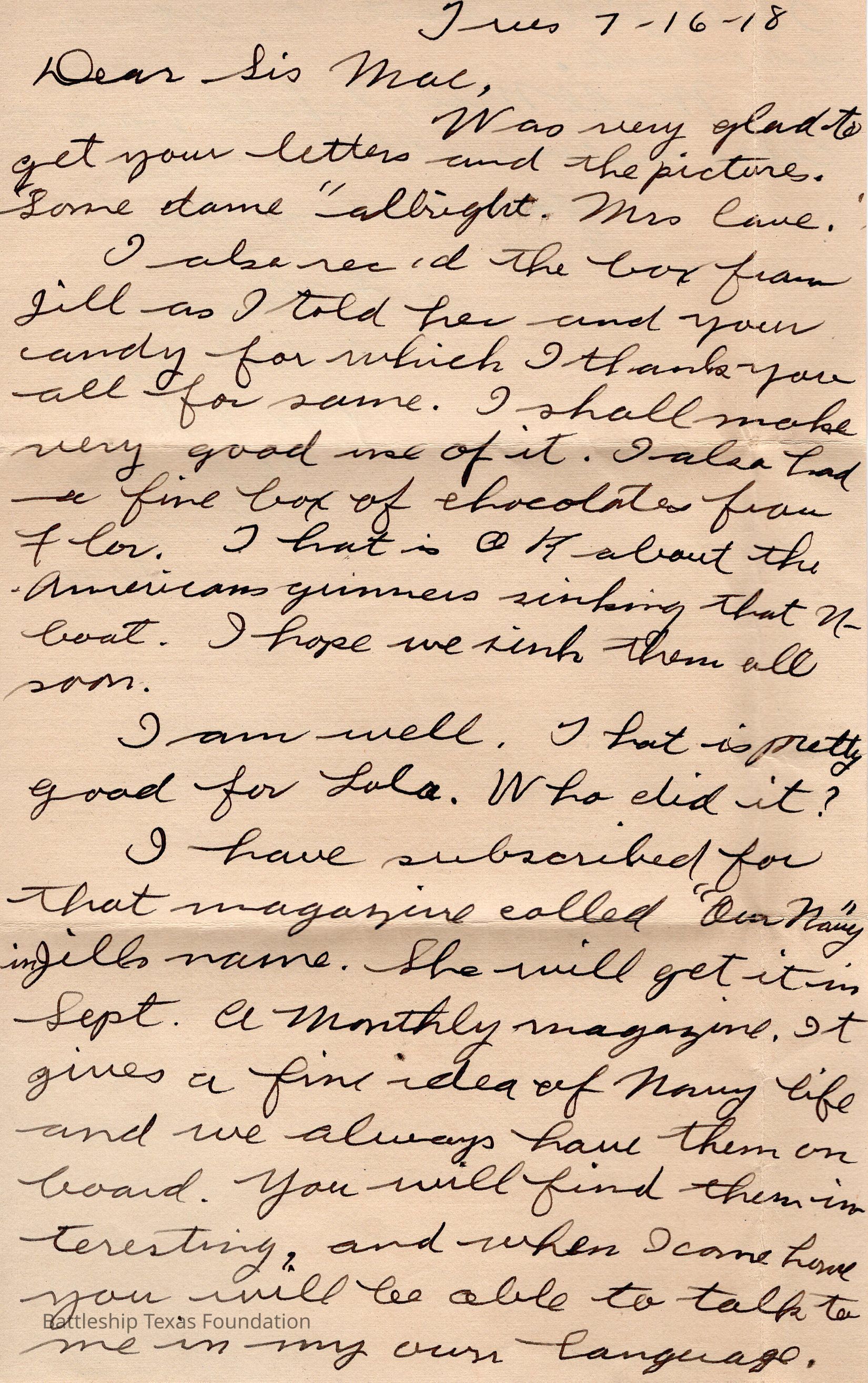 John Lamson was a MM1c on Battleship Texas from May 1917 to June 1919. Throughout his time on Texas, he sent a letter to his family at least once a week, often more. Longer stretches of absence are explained either by movement across the Atlantic, or with the Grand Fleet.