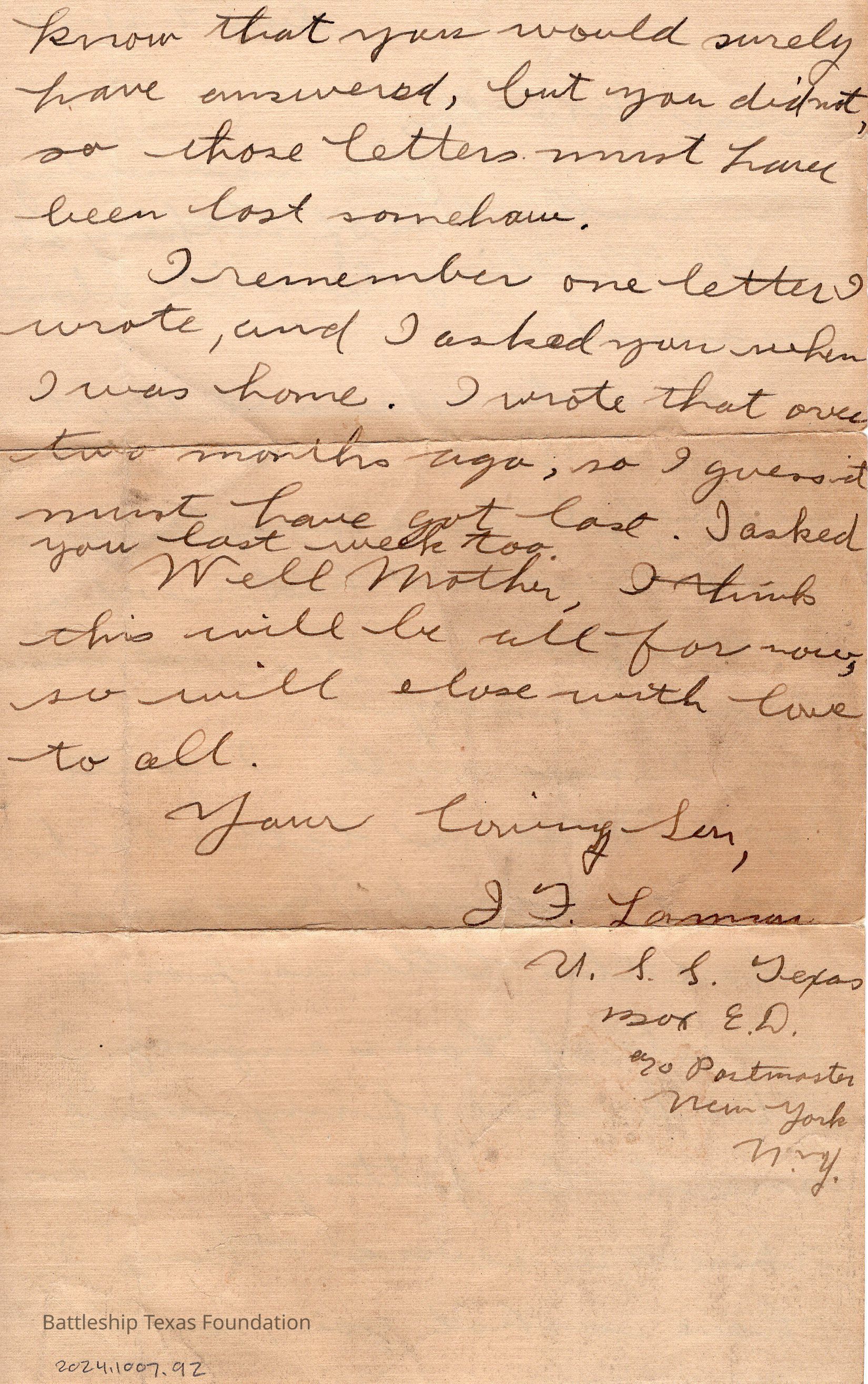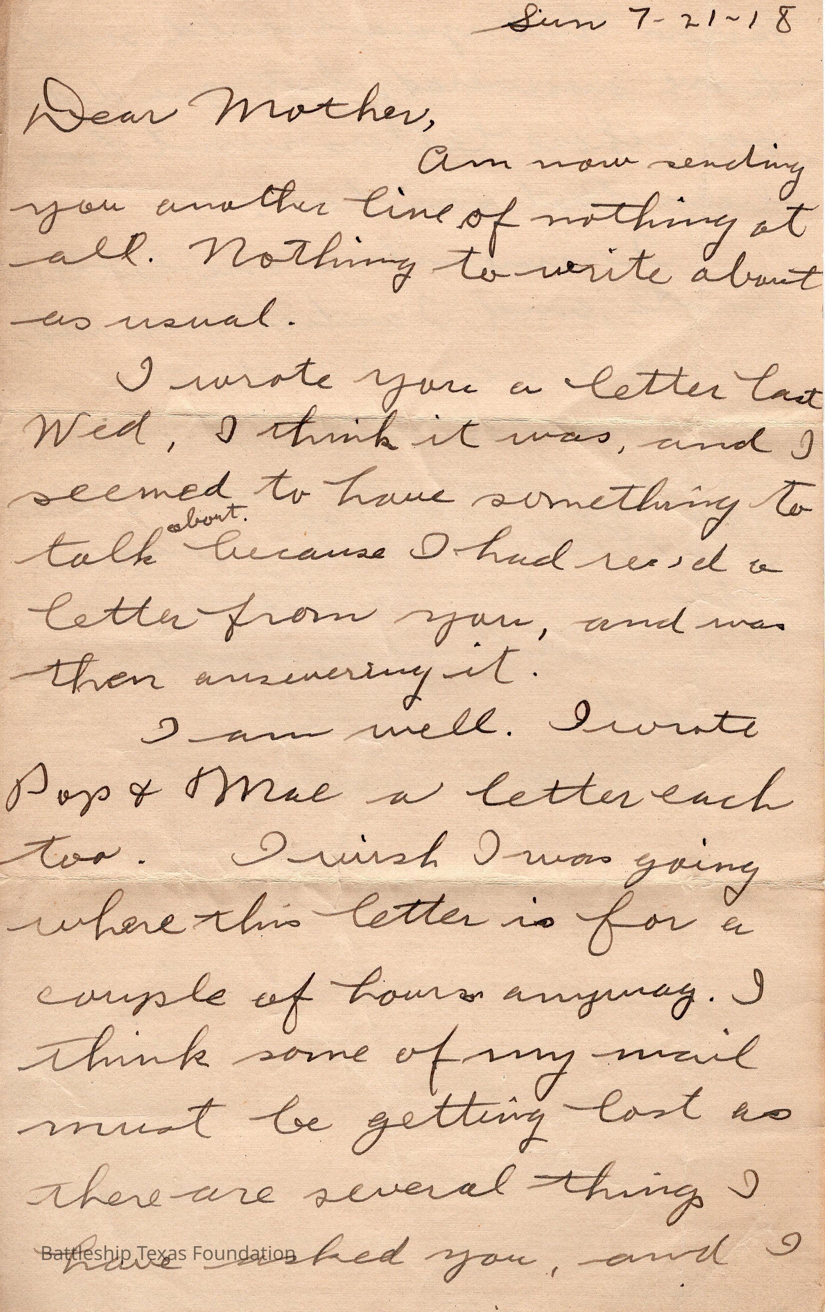 John Lamson was a MM1c on Battleship Texas from May 1917 to June 1919. Throughout his time on Texas, he sent a letter to his family at least once a week, often more. Longer stretches of absence are explained either by movement across the Atlantic, or with the Grand Fleet.