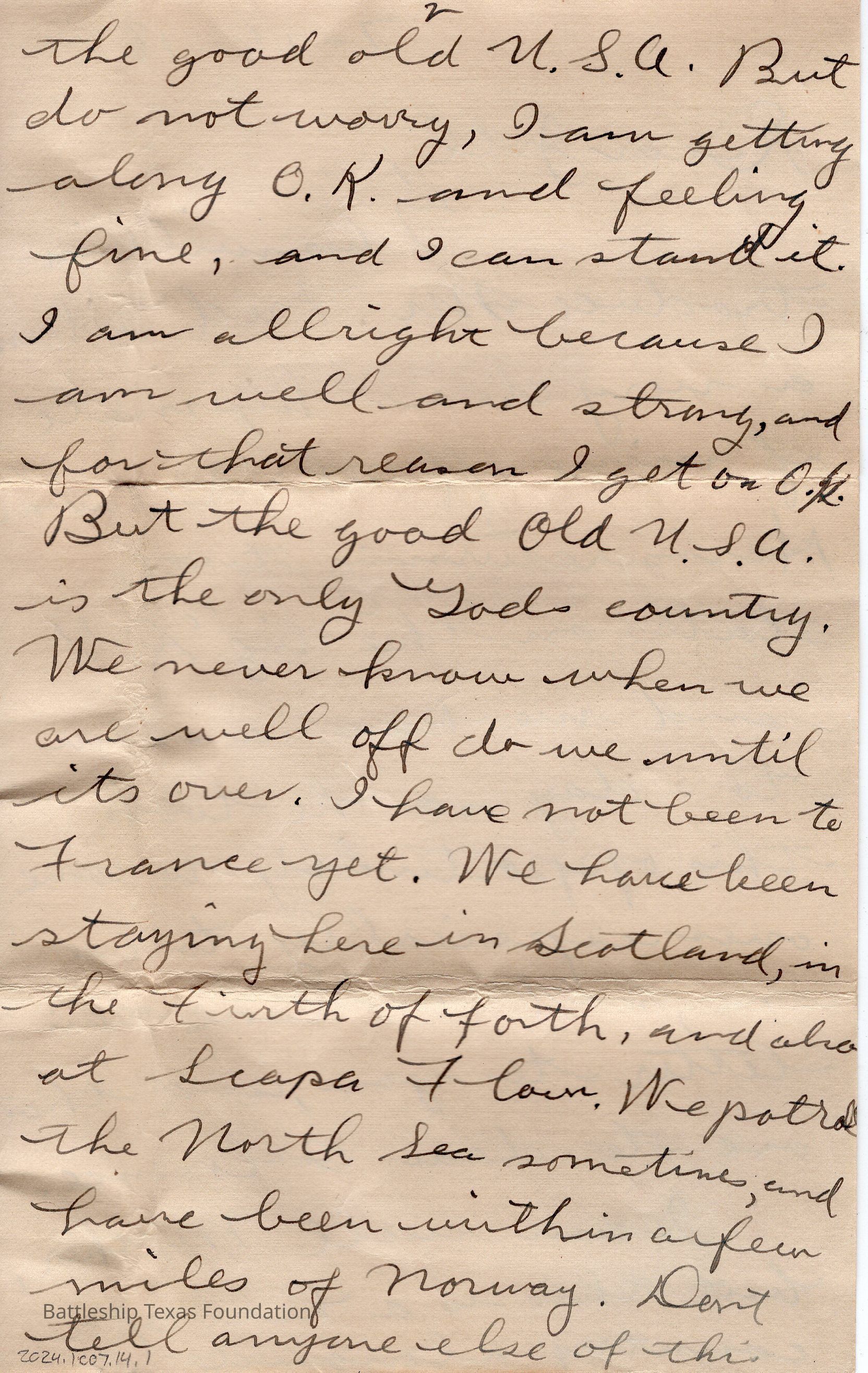 John Lamson was a MM1c on Battleship Texas from May 1917 to June 1919. Throughout his time on Texas, he sent a letter to his family at least once a week, often more. Longer stretches of absence are explained either by movement across the Atlantic, or with the Grand Fleet.