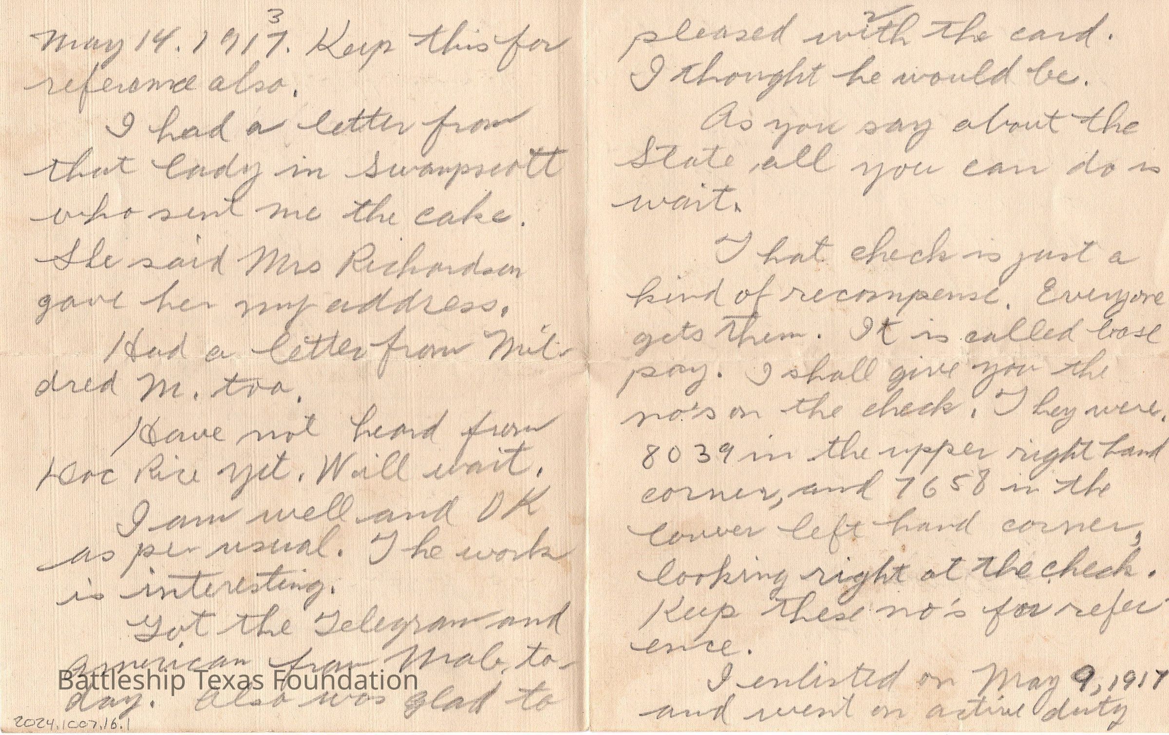 John Lamson was a MM1c on Battleship Texas from May 1917 to June 1919. Throughout his time on Texas, he sent a letter to his family at least once a week, often more. Longer stretches of absence are explained either by movement across the Atlantic, or with the Grand Fleet.