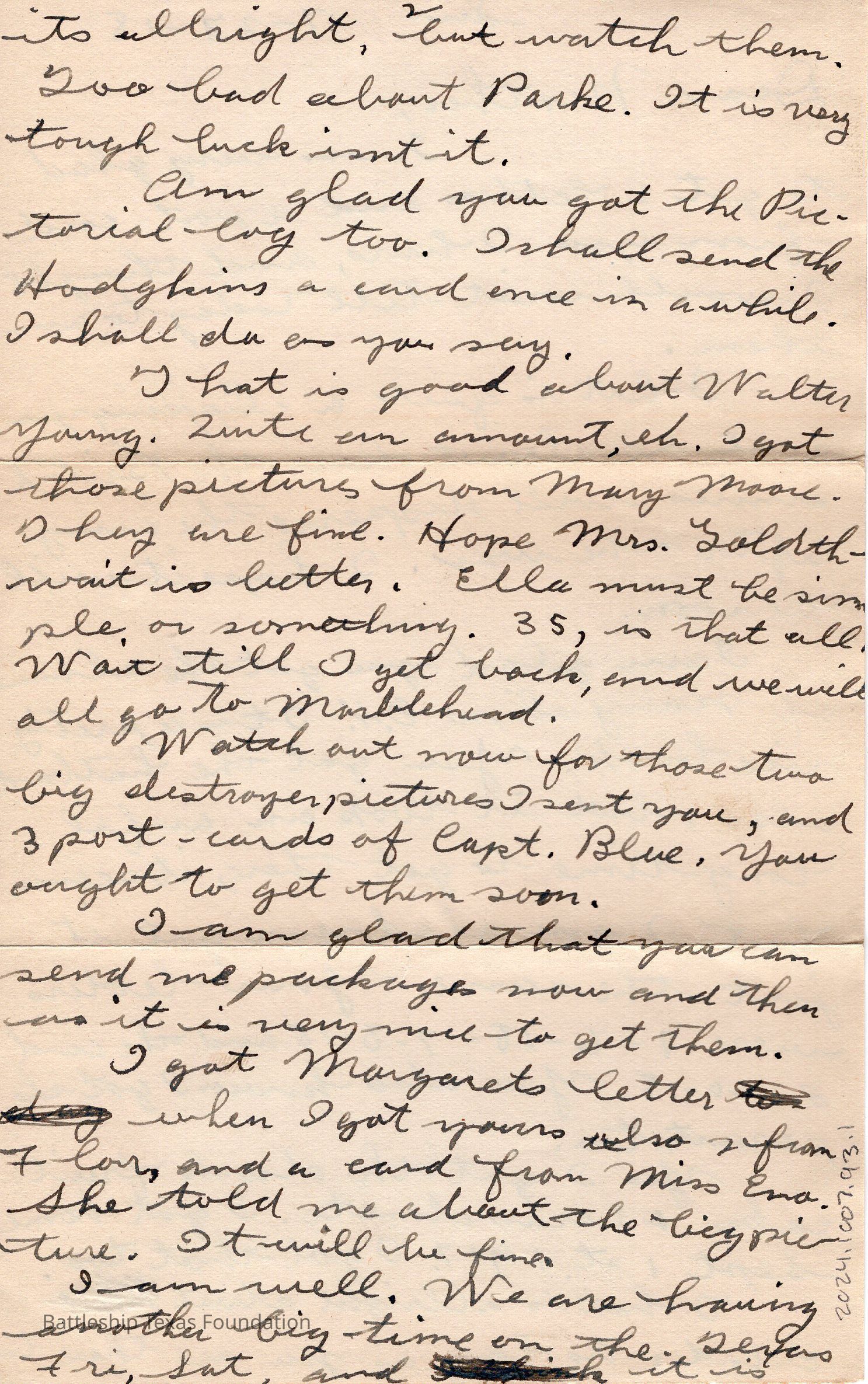 John Lamson was a MM1c on Battleship Texas from May 1917 to June 1919. Throughout his time on Texas, he sent a letter to his family at least once a week, often more. Longer stretches of absence are explained either by movement across the Atlantic, or with the Grand Fleet.