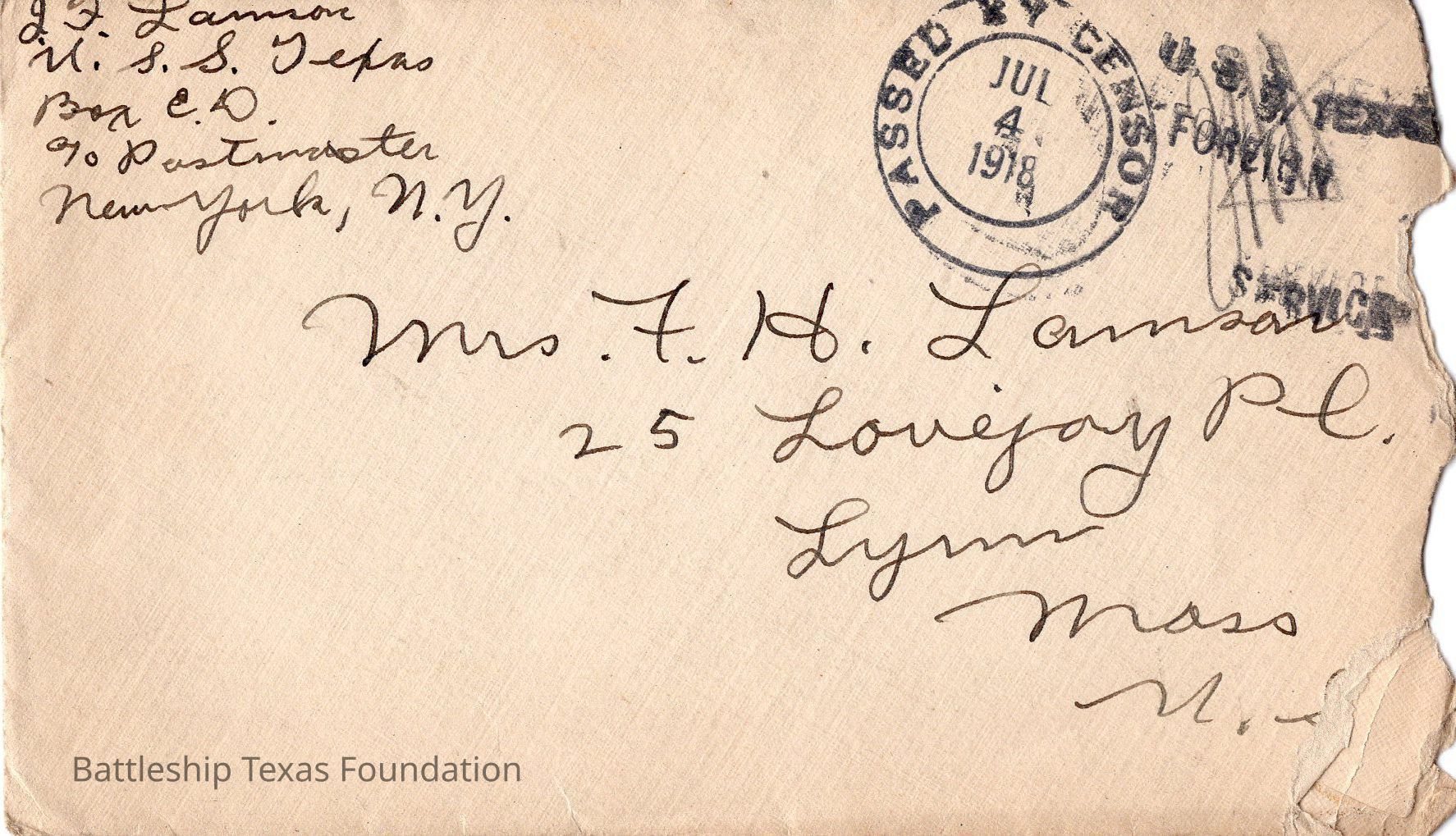 Envelope stamped "PASSED BY CENSOR JUL 4 1918" and "U.S.S. TEXAS FOREIGN SERVICE"Context