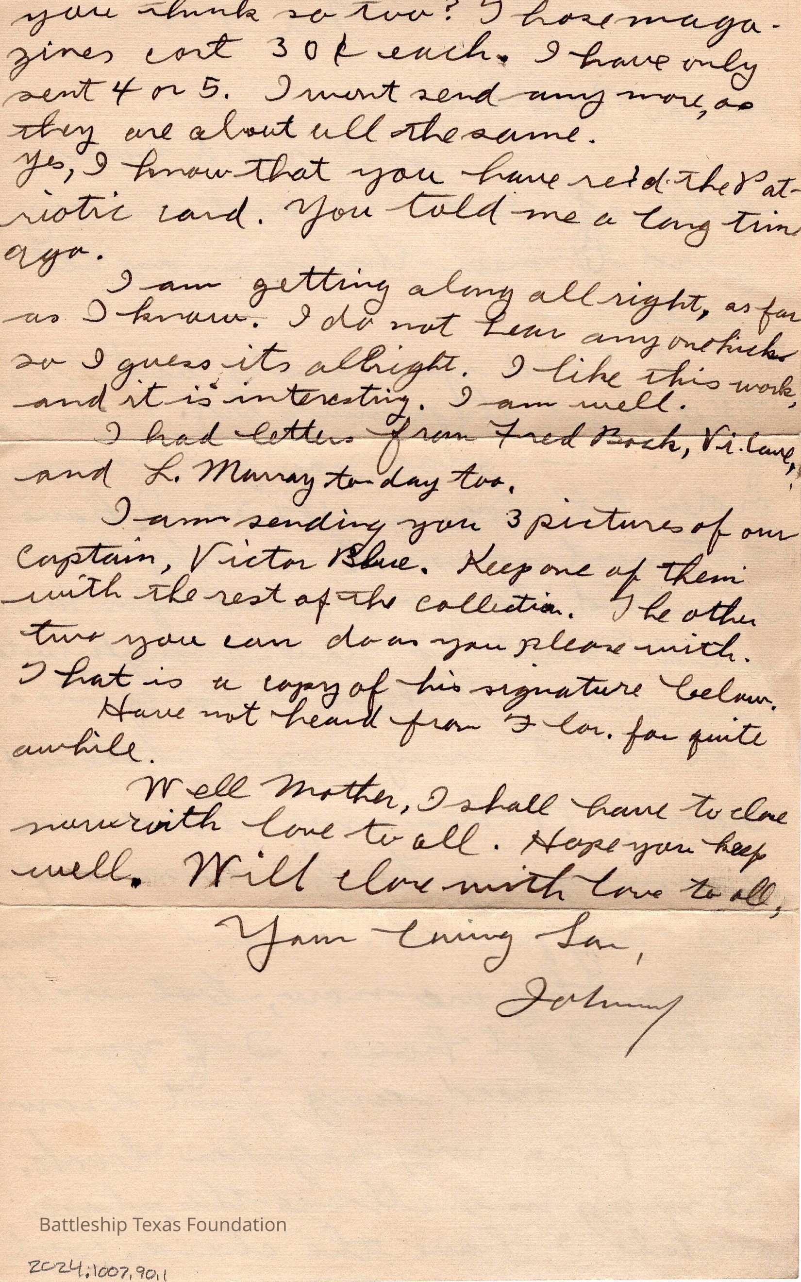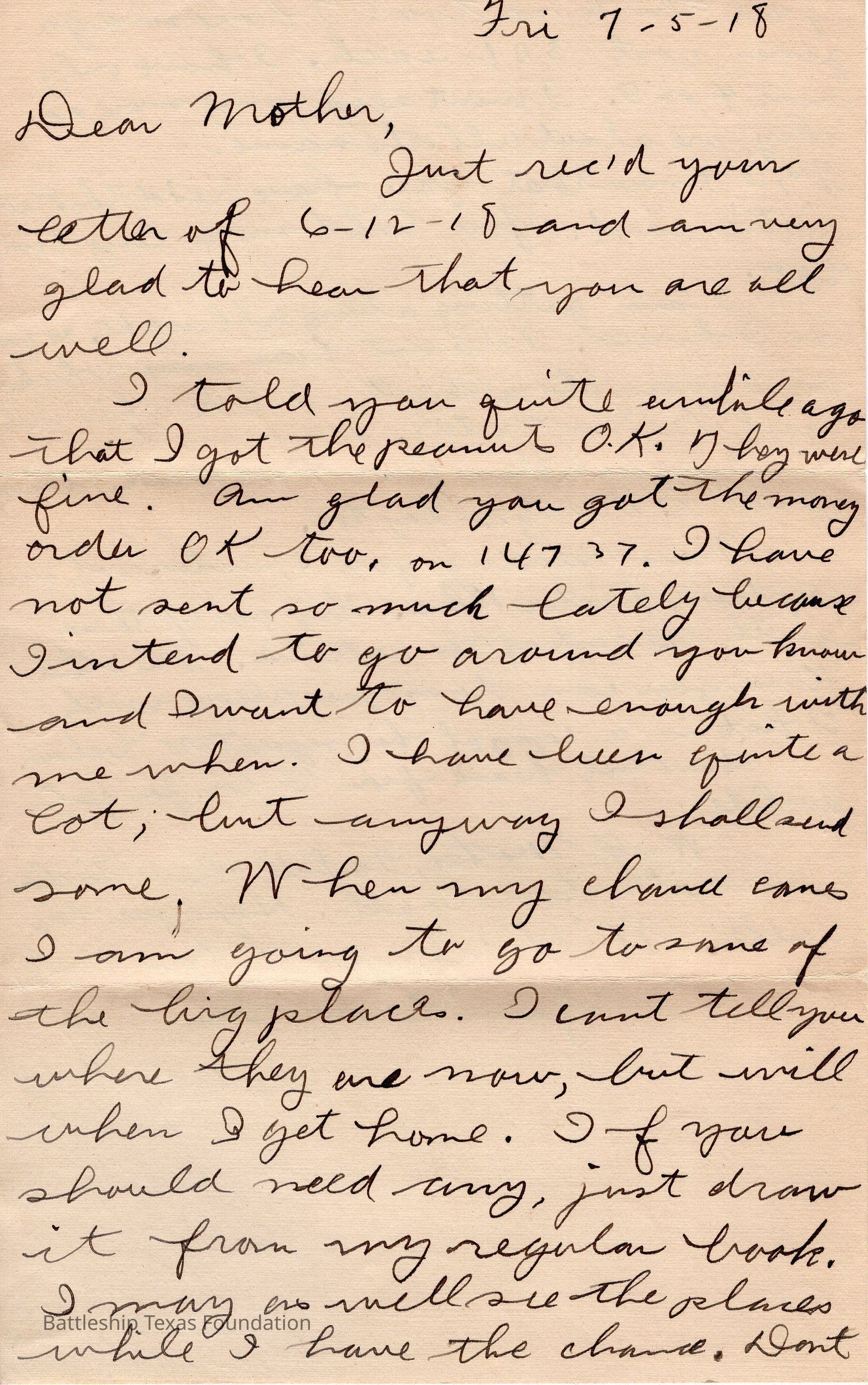 John Lamson was a MM1c on Battleship Texas from May 1917 to June 1919. Throughout his time on Texas, he sent a letter to his family at least once a week, often more. Longer stretches of absence are explained either by movement across the Atlantic, or with the Grand Fleet.