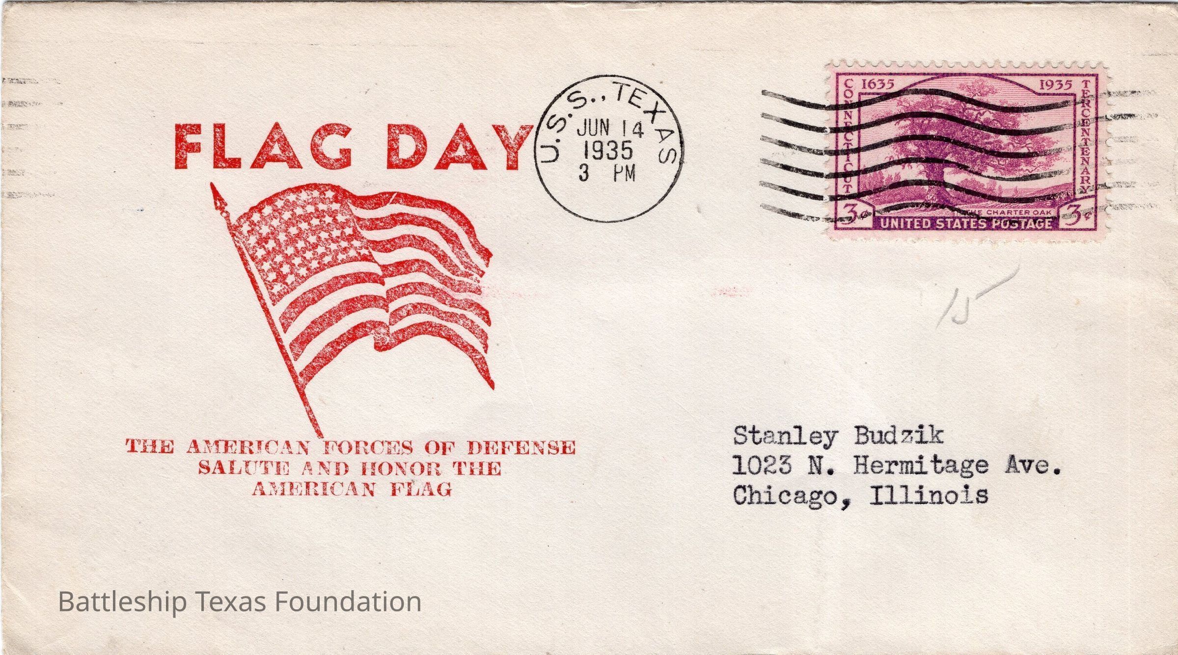 Addressed to Stanley Budzik. Envelope sent from USS Texas on the afternoon of June 14, 1935. Features a "FLAG DAY" stamp with a 48-star US flag and captioned "the American Forces of defense salute and honor the American flag"