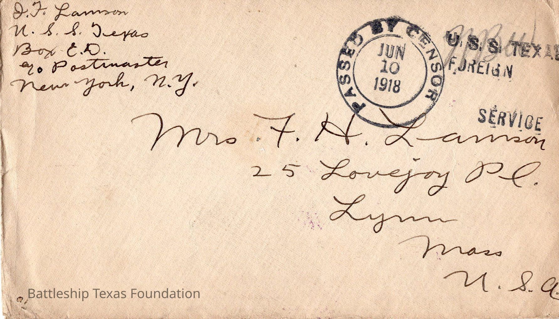 Envelope stamped "PASSED BY CENSOR JUN 10 1918" and "U.S.S. TEXAS FOREIGN SERVICE"Context