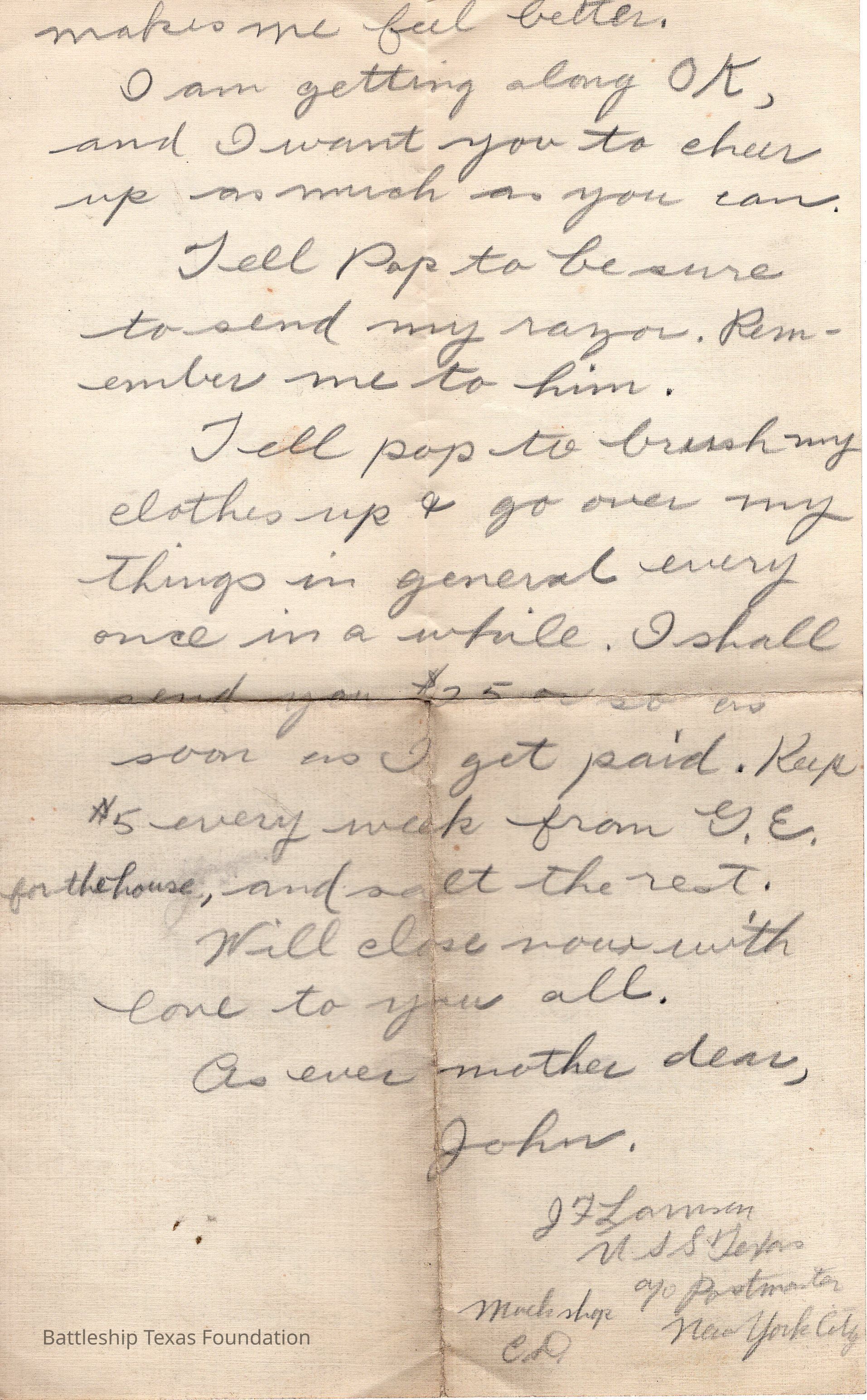 John Lamson was a MM1c on Battleship Texas from May 1917 to June 1919. Throughout his time on Texas, he sent a letter to his family at least once a week, often more. Longer stretches of absence are explained either by movement across the Atlantic, or with the Grand Fleet.