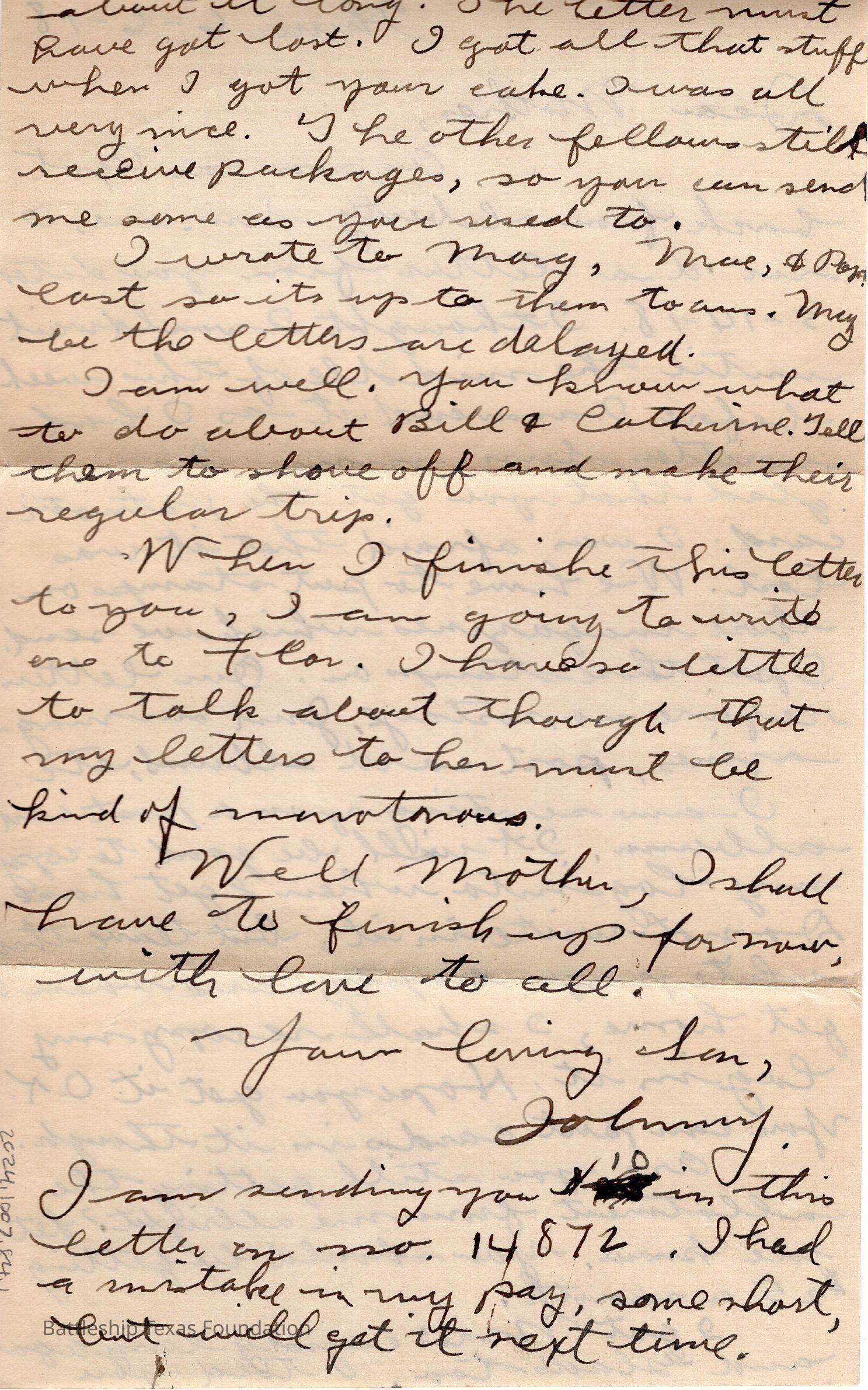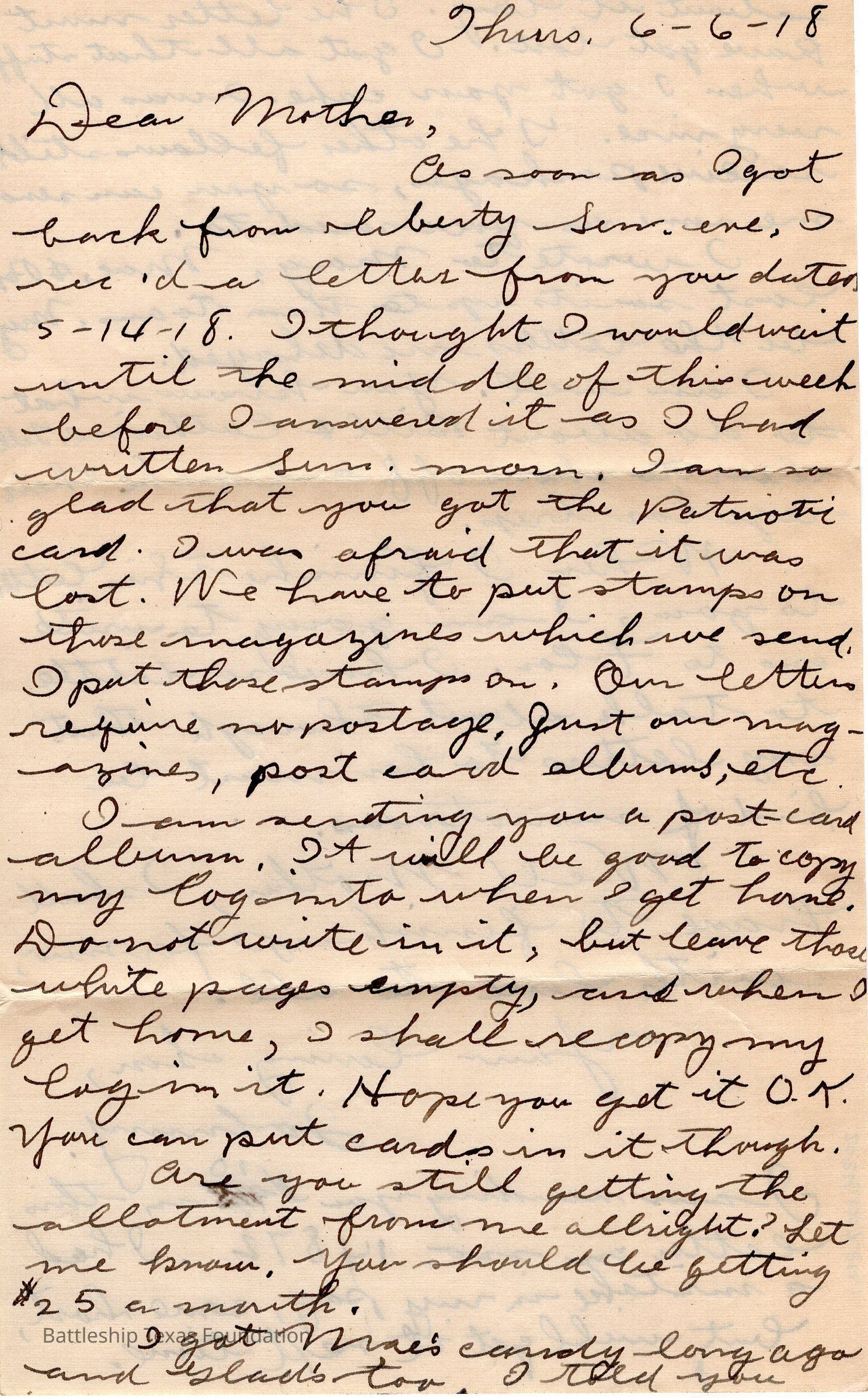 John Lamson was a MM1c on Battleship Texas from May 1917 to June 1919. Throughout his time on Texas, he sent a letter to his family at least once a week, often more. Longer stretches of absence are explained either by movement across the Atlantic, or with the Grand Fleet.