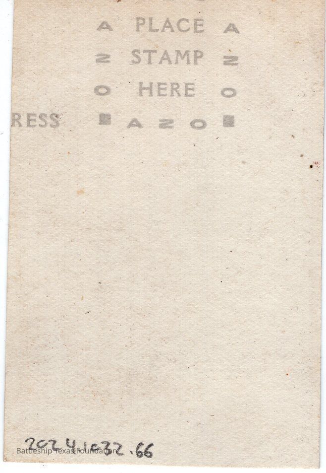 From a donated collection of individual photographs and pages out of a 1930s Texas crewmember's photo album. Items donated by the Los Angeles Maritime Museum. Many photographs had writing on the pages of the book, now discarded. The caption formerly on the page for this photo read,