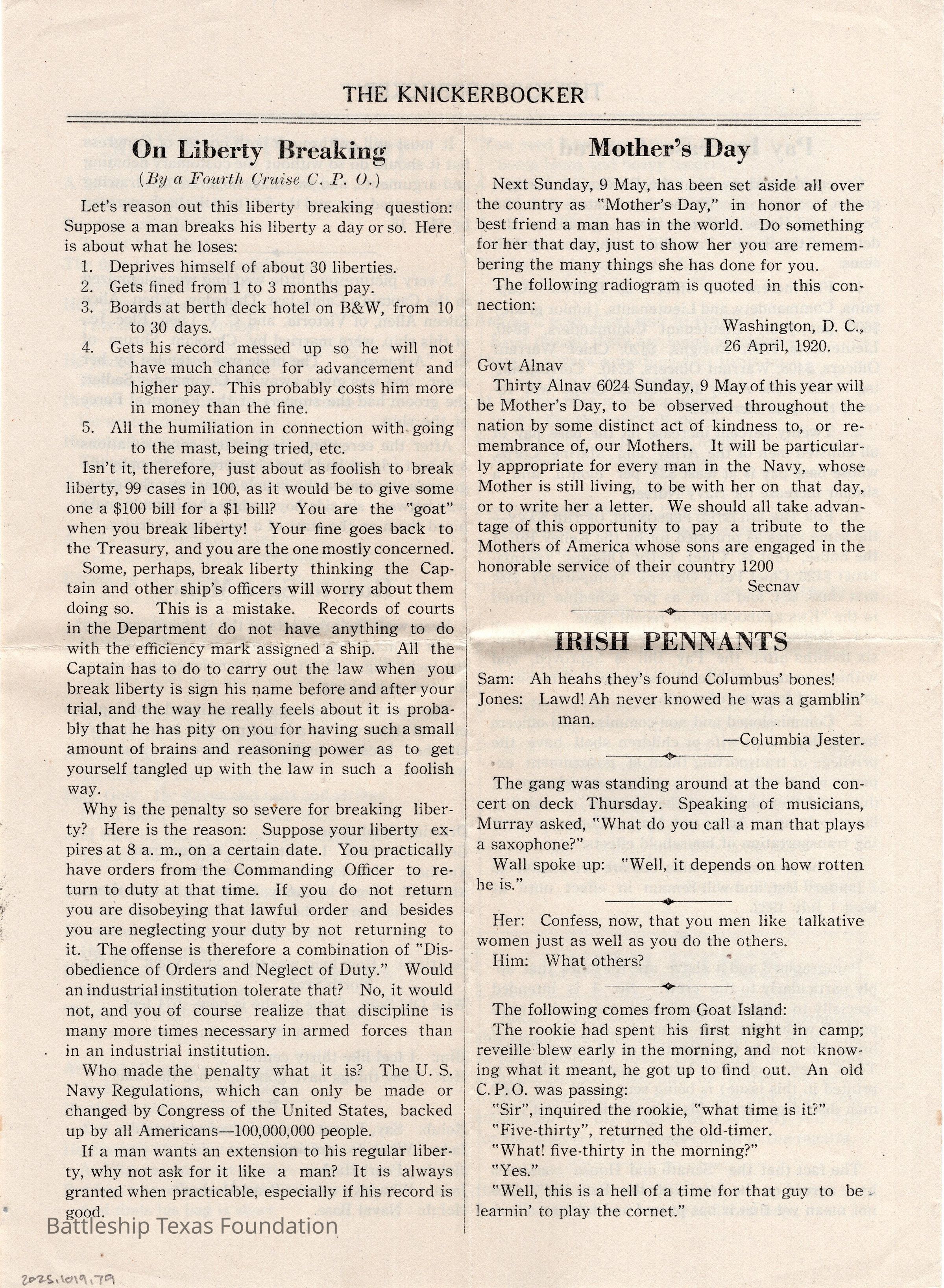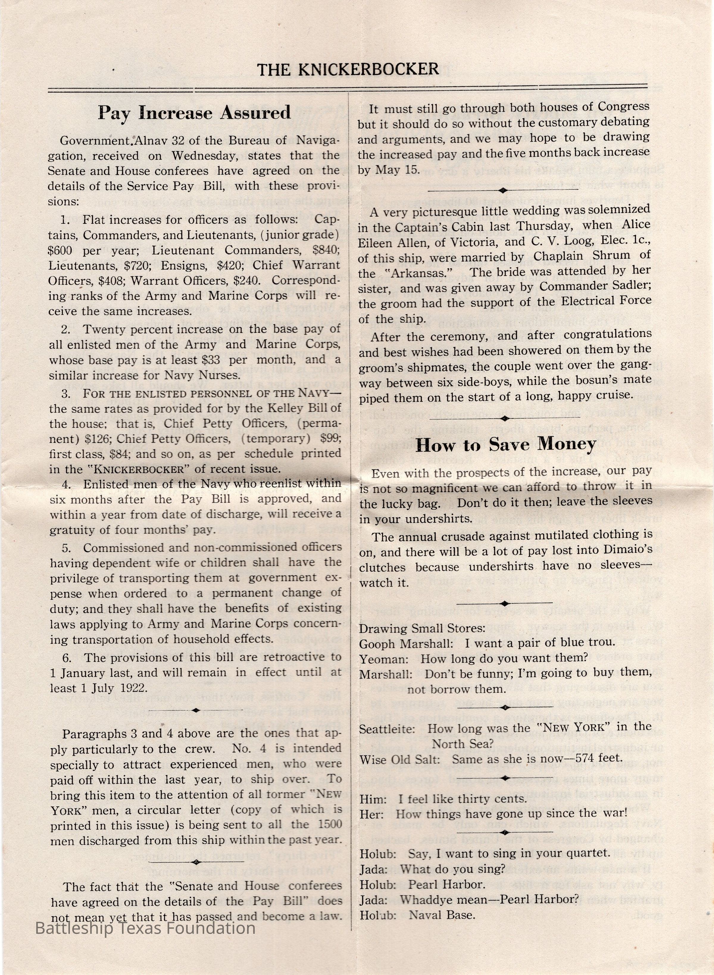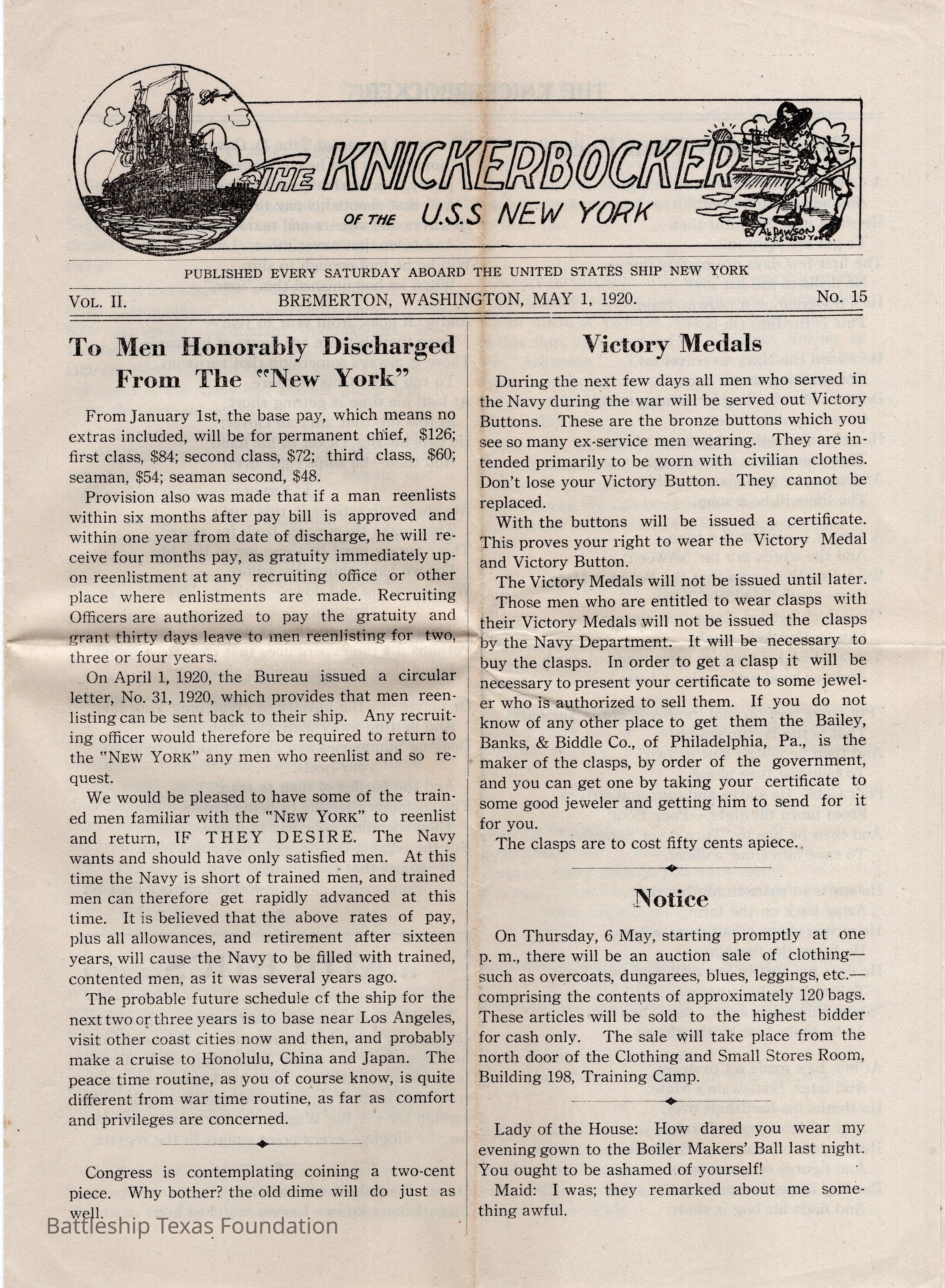 “The Knickerbocker” was a biweekly paper, started in 1920, and published jointly by the midshipmen and enlisted men of Battleship New York. The paper was published until 1936, running a total of sixteen volumes, with some special issues.Collection