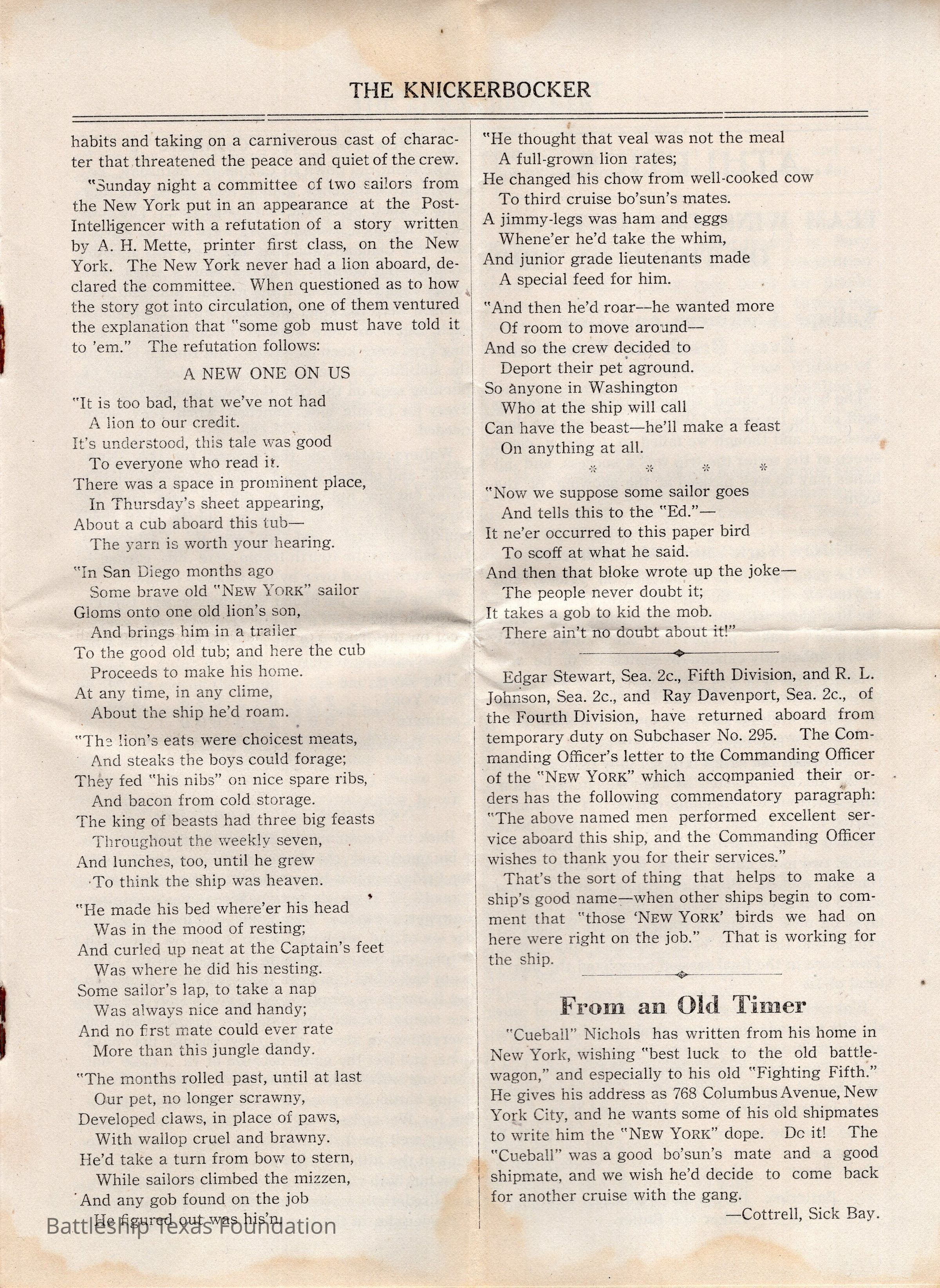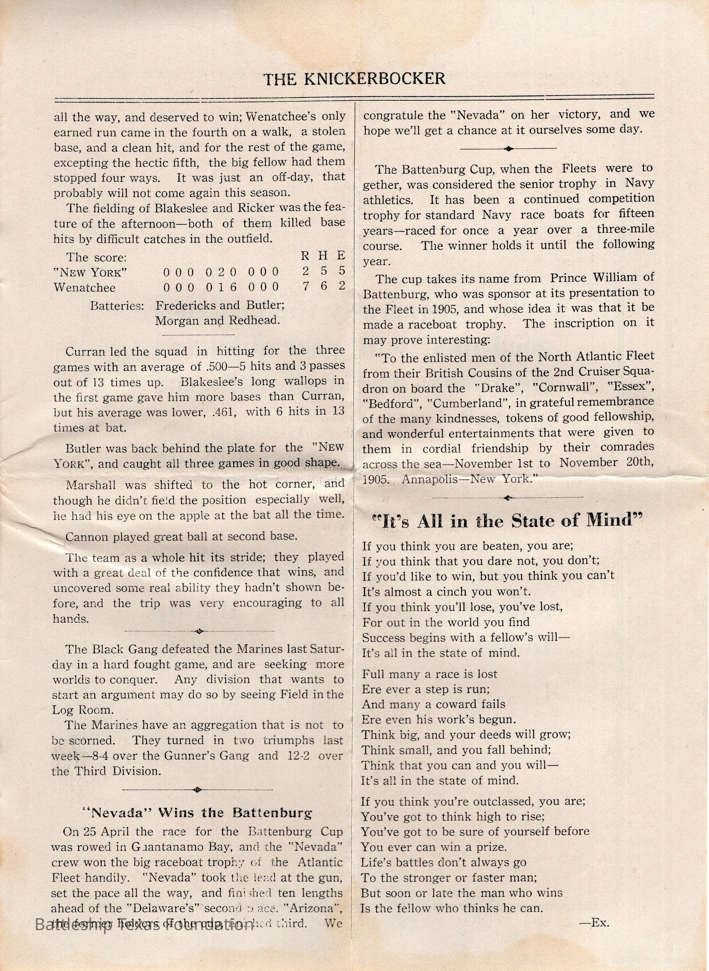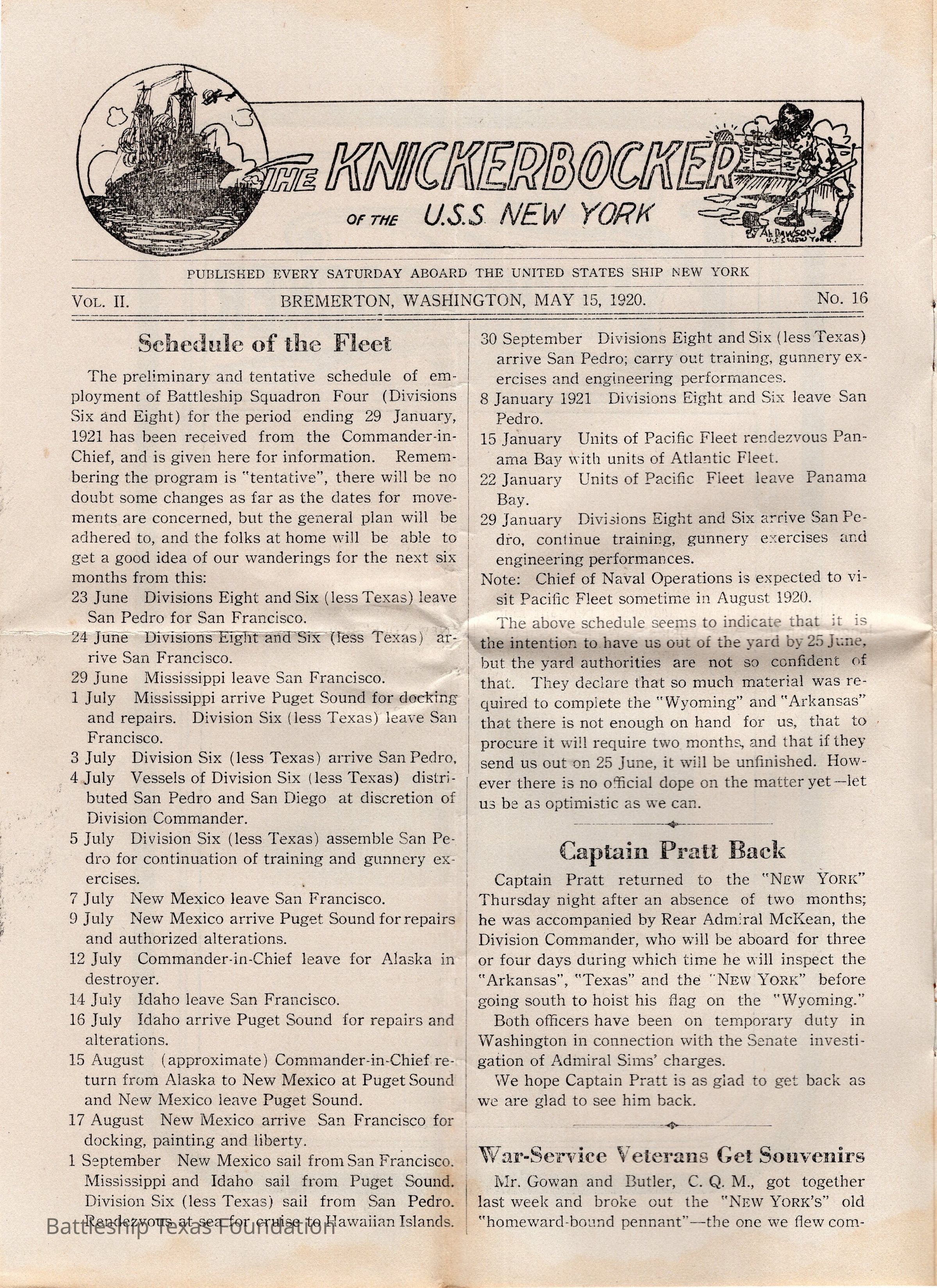 “The Knickerbocker” was a biweekly paper, started in 1920, and published jointly by the midshipmen and enlisted men of Battleship New York. The paper was published until 1936, running a total of sixteen volumes, with some special issues.Collection