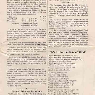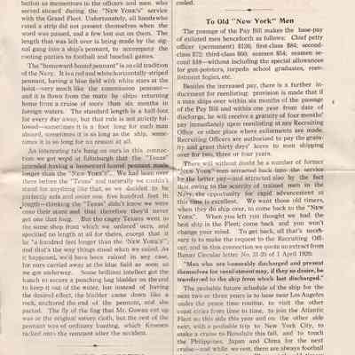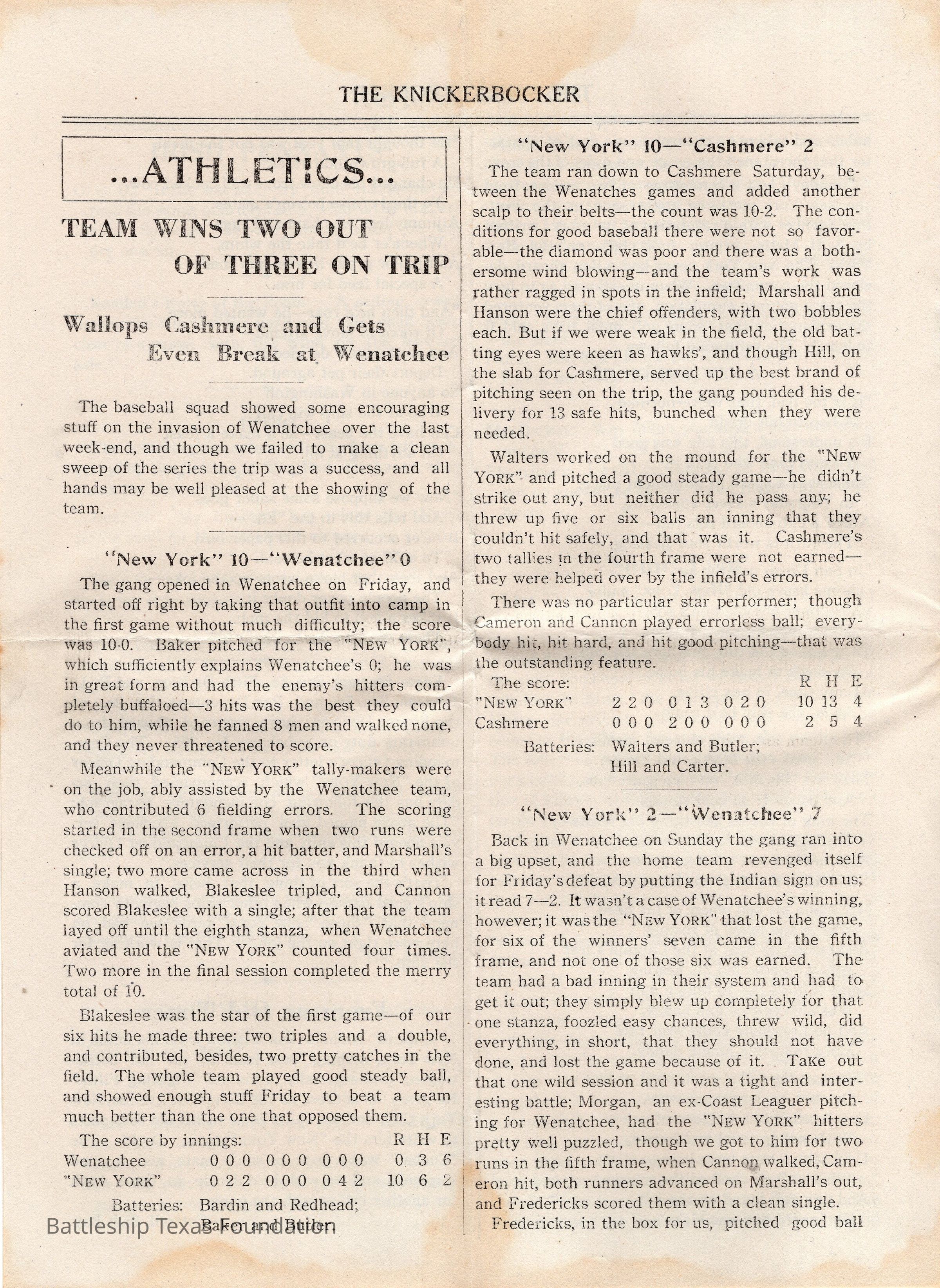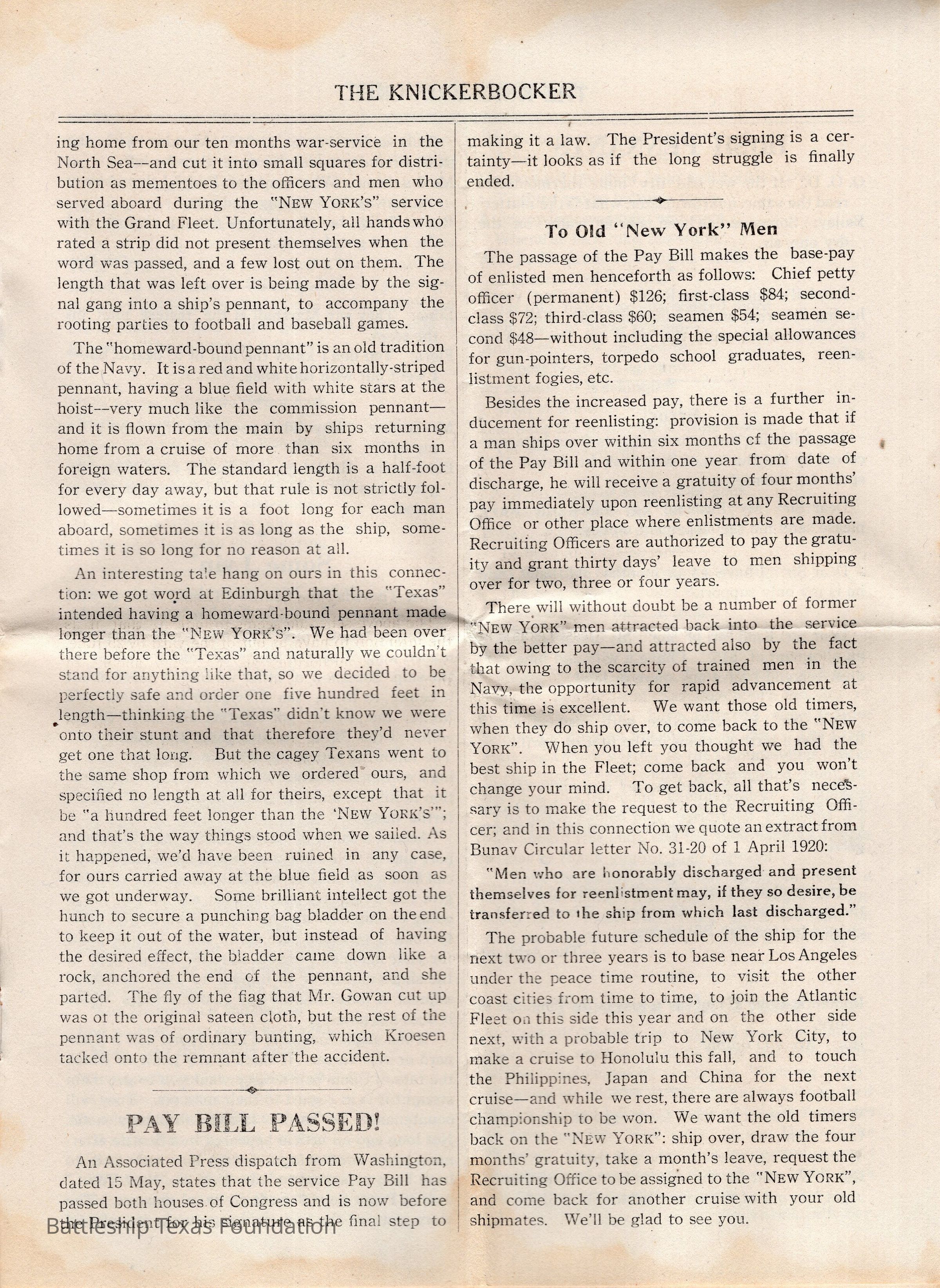 “The Knickerbocker” was a biweekly paper, started in 1920, and published jointly by the midshipmen and enlisted men of Battleship New York. The paper was published until 1936, running a total of sixteen volumes, with some special issues.Collection