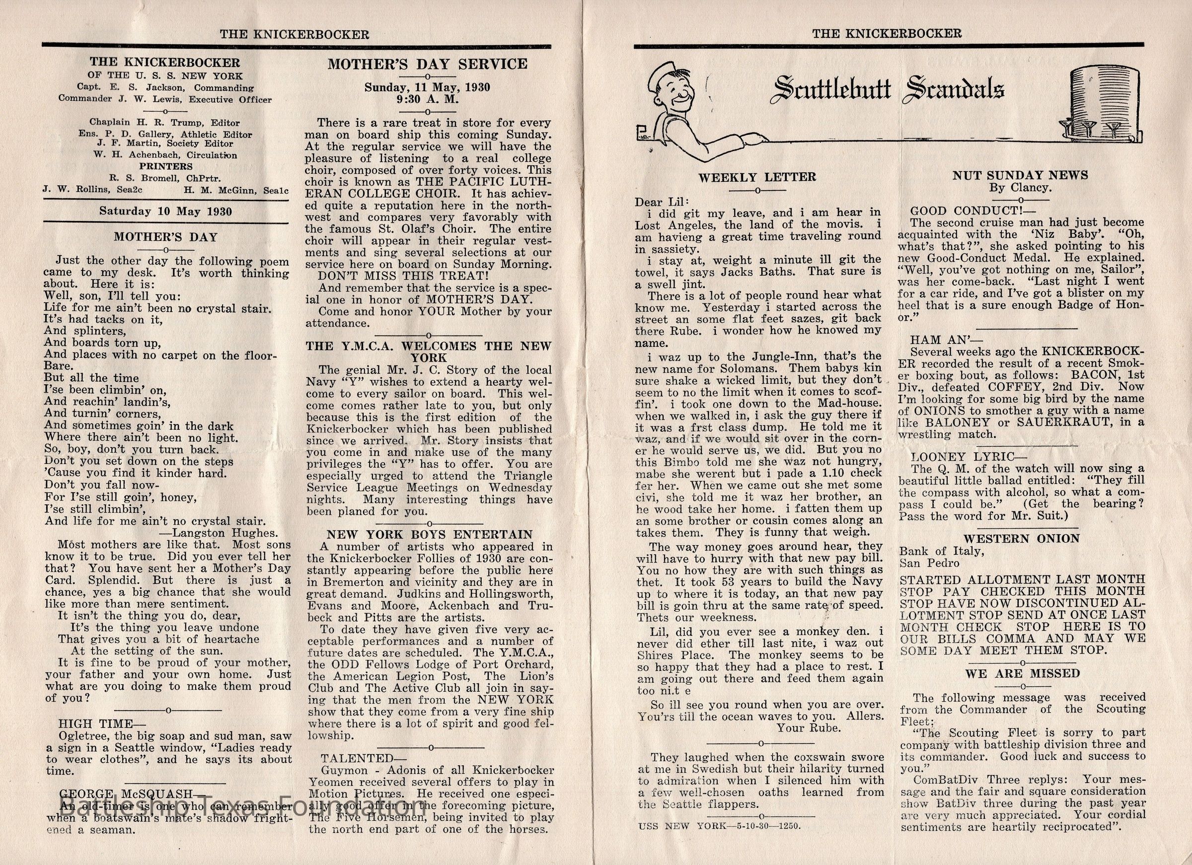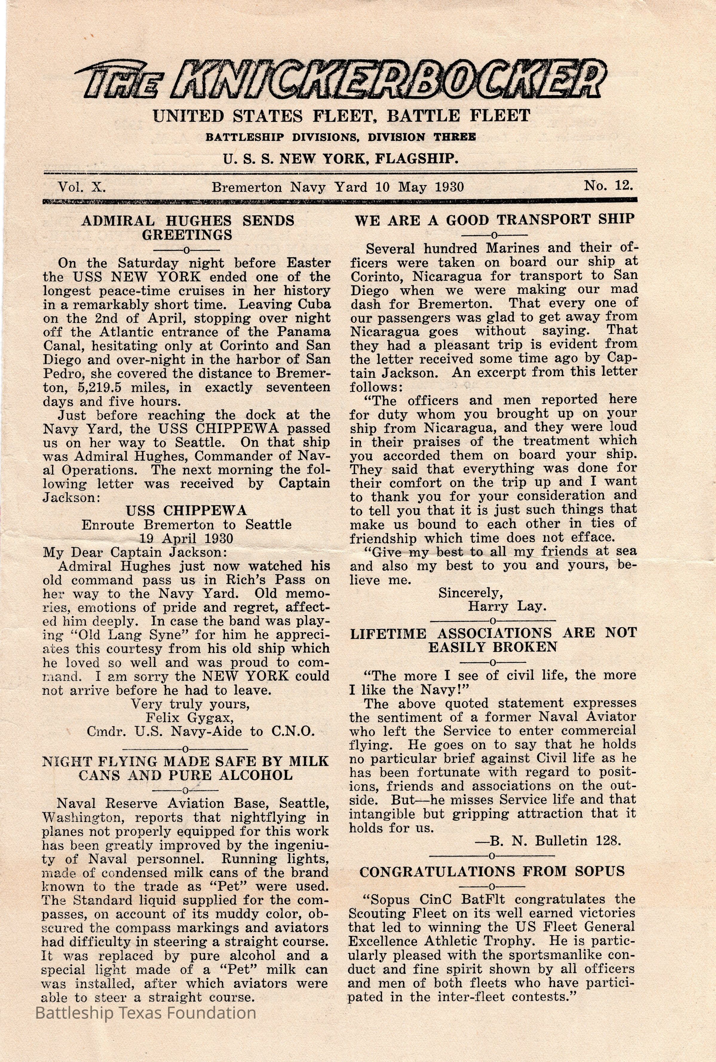 Knickerbocker four page foldout Volume 10 issue 12. Published in Bremerton Navy Yard in Washington, on May 10, 1930.Context